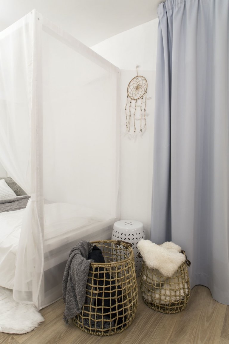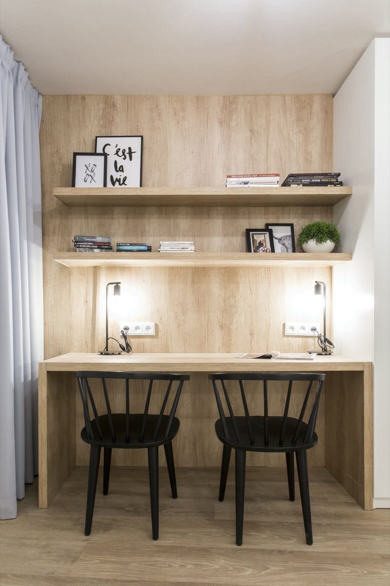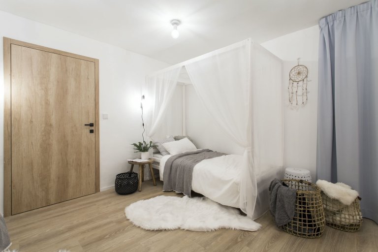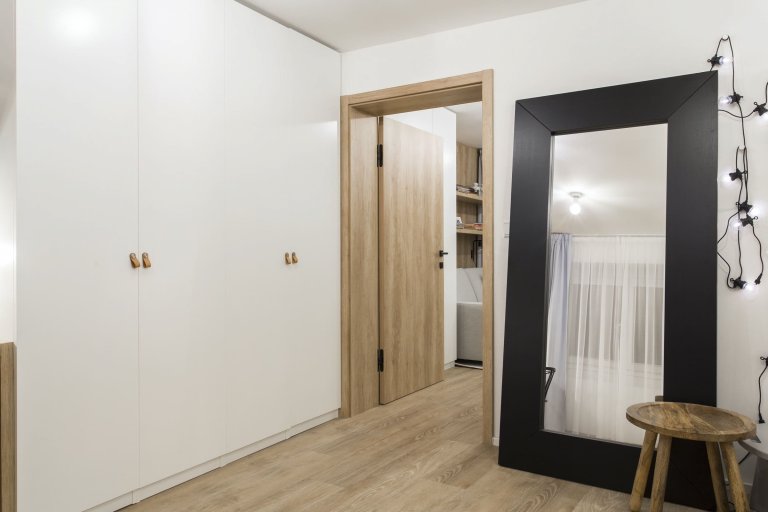 Díky malé metráži bytu, nemohli designéři měnit dispozice. Ponechali tak rozdělení bytu na pokoj pro maminku a pokoj pro dcery, přičemž se zaměřili právě na dosažení tepelného komfortu v interiéru a s tím spjatého odstranění vlhkosti a plísní. K zateplení si tak dopomohli podhledem, kdy odebrali podbití, a prostor kolem trámů vyplnili kvalitní izolací. Původní studenou podlahu vystřídala příjemná vinylová podlaha světle dubové barvy. Proměnou prošel také nevyhovující kuchyňský kout. Kuchyně získala jednotný charakter a plnohodnotnou kuchyňskou linku.