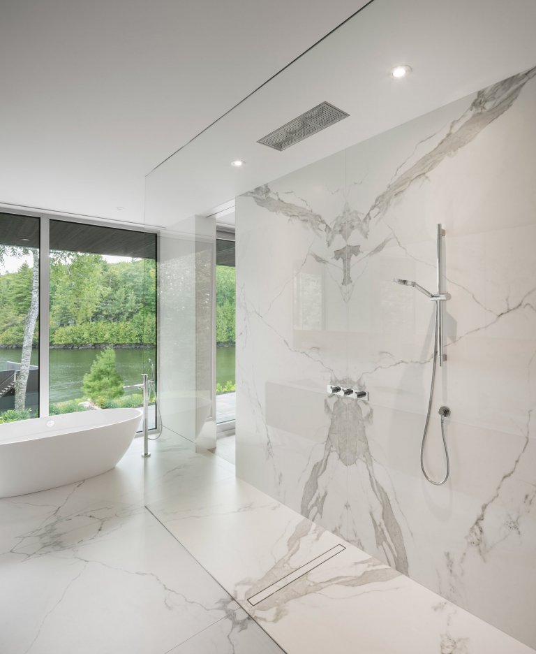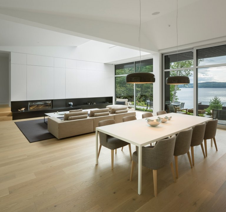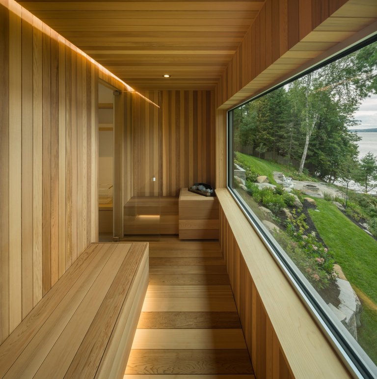 Úložné prostory byly navrženy tak, aby zakryly všechny technické aspekty. Televize je tak ukryta a neruší jinak krásný design místnosti. K doladění atmosféry je zde vestavěný krb, jenž místu dodává elegantní nádech. Z těchto prostor se dostaneme na venkovní terasu se zahradou, odkud je dokonalý výhled na přilehlé jezero. Z terasy se dostaneme k dvoupodlažní loděnici, která je posazená na vodě.