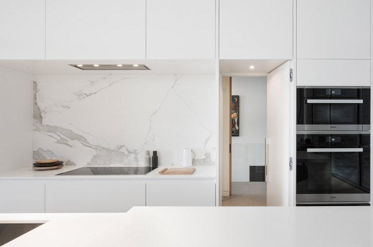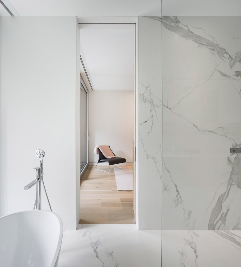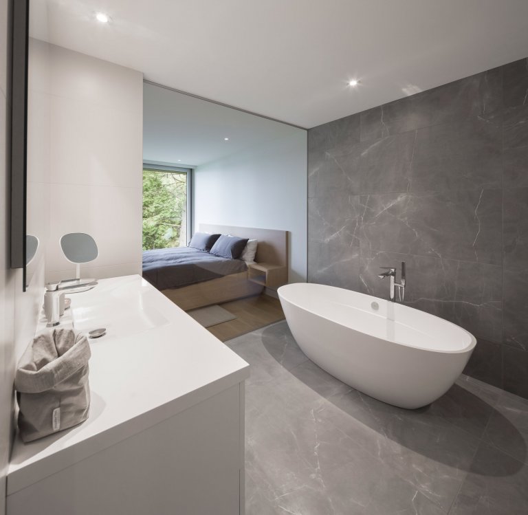 V kuchyni se nachází „tajné“ dveře, jimiž se dostaneme do prádelny s komorou. Ze soukromějších místností jsou zde tři ložnice s vlastní koupelnou, tělocvična, sauna, garáž a relaxační místnost. Za skvost lze považovat hlavní koupelnou, kterou zdobí oválná, volně stojící vana Terrassa značky Victoria + Albert. Vana je z materiálu QUARRYCAST, který je vysoce odolný a vyrobený z jemně mletého vulkanického vápence smíchaného s pryskyřicí. Obklady i dlažba jsou z mramoru Carrara od výrobce Neolith.