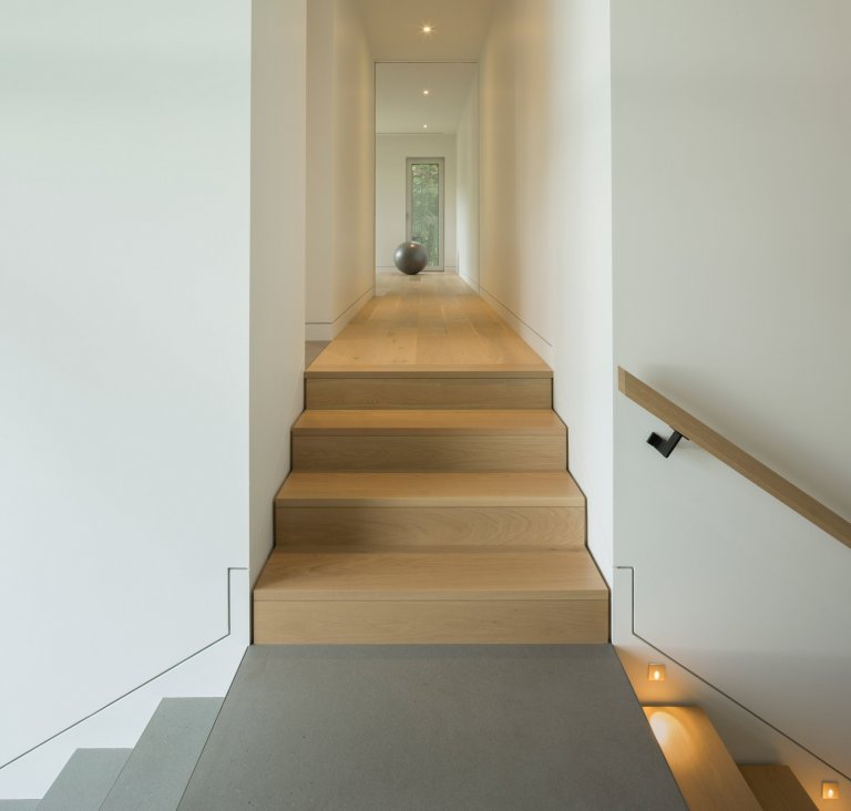 Do domu se přistupuje po příjezdové cestě – a to rovnou do prvního patra. Celý interiér je přímo pod záplavou přirozeného denního světla díky arkýřovým oknům (bay windows) a světlíkům. Okna jsou realizací francouzské firmy Alumilex. Všechny místnosti jsou vytvořeny tak, aby na sebe navzájem navazovaly v jedné lineární řadě. Kuchyně je propojena s jídelnou i obývacím pokojem. Tyto místnosti spolu tvoří jakousi centrální část prvního patra, v níž se mohou všichni scházet. Kuchyně je velmi moderní a nadčasová – vzhledem ke své bílé barvě splývá se stěnou, což ji opticky protahuje až ke stropu. Ostrůvek naopak vystupuje z dubové podlahy.