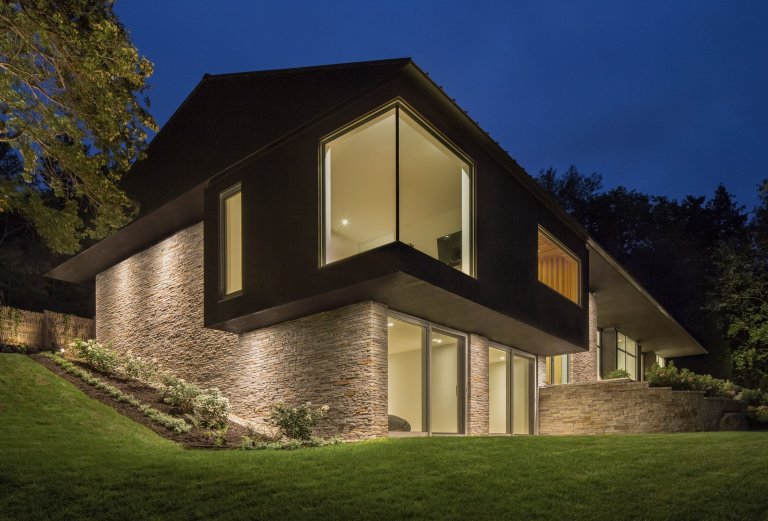 K vytvoření fasády byly vybrány dva přírodní materiály – žula a dřevo. Palubky, které tvoří dřevěný obklad, jsou k domu připevněny svisle, což umocňuje dojem strmější střechy. Naopak, žulové obklady jsou připevněny horizontálně, což stavbu opticky rozšiřuje. Aby nebylo tmavé barvy na domě moc, interiér je naopak od tmavého exteriéru vzdušný a světlý.