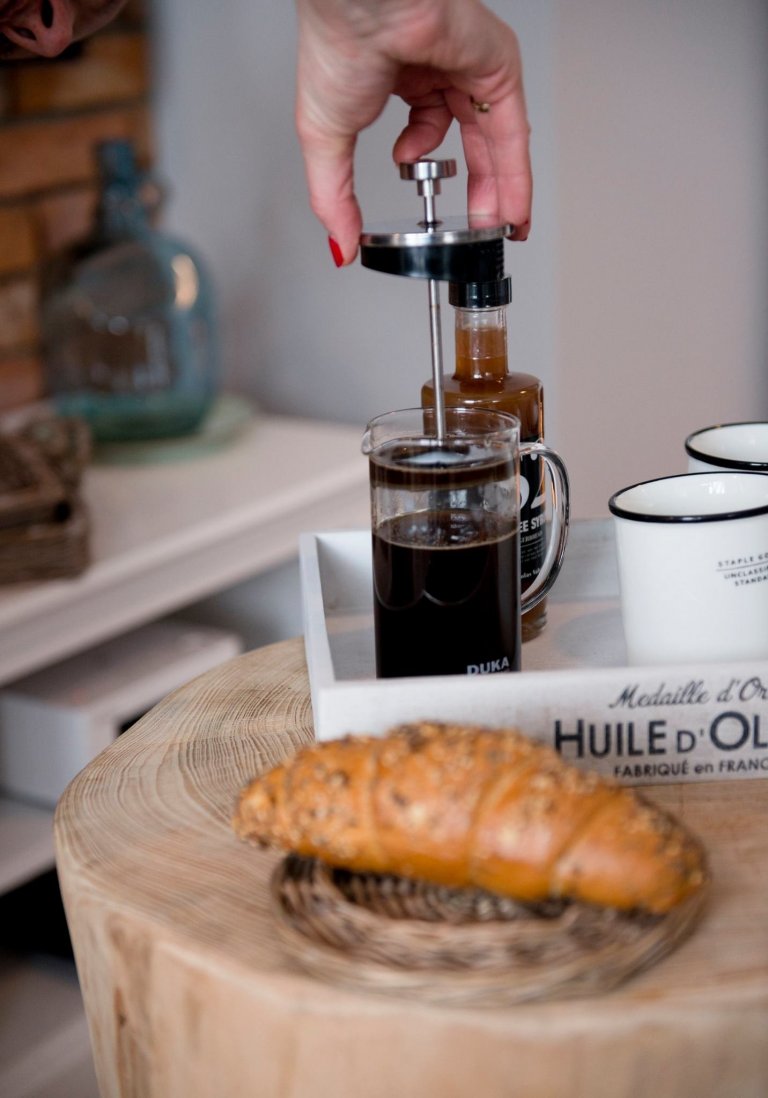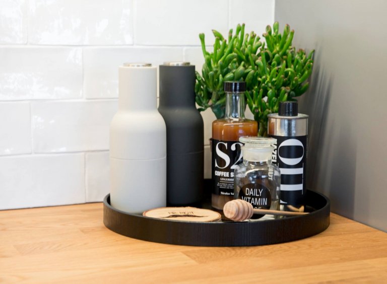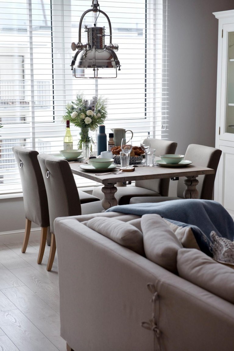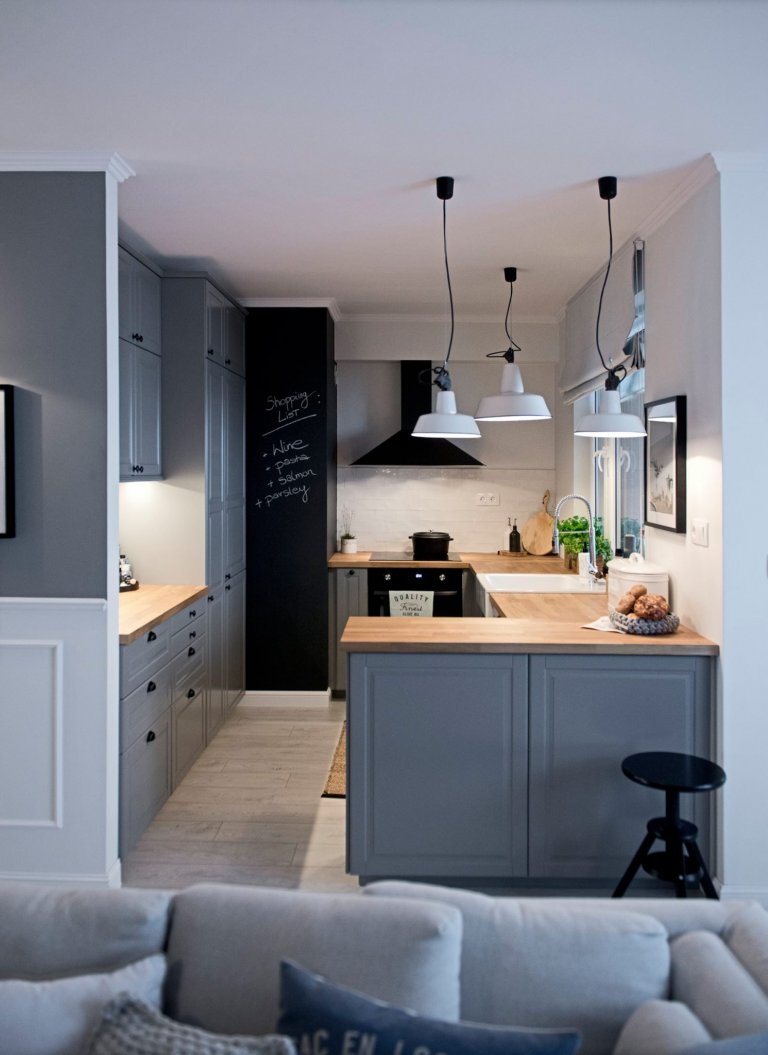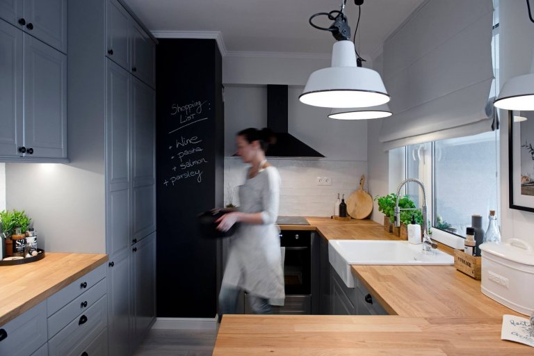 U obývacího pokoje si můžeme povšimnout, že slouží zároveň jako jídelna. Obě tyto části jsou tvořeny ve stejném duchu tak, aby k sobě dokonale zapadaly. Pozornost na sebe přitahuje dřevěný konferenční stolek, který doplňuje "pufík" (lze považovat za sedací "bobek") ve tvaru kamene. Teplo domova nám zajišťuje krb. Kuchyně je úplná symfonie dřeva. Skříně jsou tvořeny v šedo-modrém odstínu a jako kontrast se zde nabízejí černé prvky ve formě stoliček. Za pohled stojí i černá stěna, která je natřena tabulovou barvou, což se hodí pro každou kreativní duši.