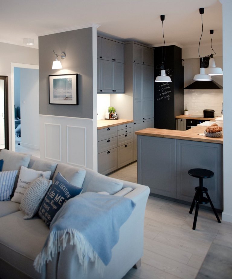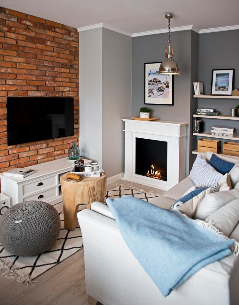 Hned ze začátku bychom si měli říct, že hlavním cílem projektu bylo navození atmosféry v přímořském duchu. Samotný přímořský styl je úchvatný v kombinacích různých barev, nejčastěji však modré, která nám připomíná barvu moře, odtud také pochází název stylu. Konkrétně u tohoto projektu si studio poradilo s kombinací barev přímo skvěle. Vsadili na jistotu, a proto v apartmánu najdeme světlé barvy, které celý prostor prosvětlí. Bílá barva je doplňována světle šedými tóny, které přechází do několika odstínů modré barvy. Kontrast zde tvoří velká cihlová stěna v obývacím pokoji.