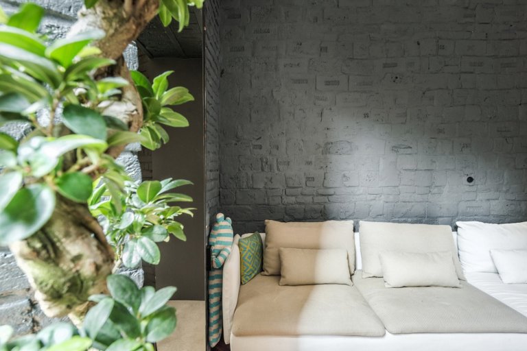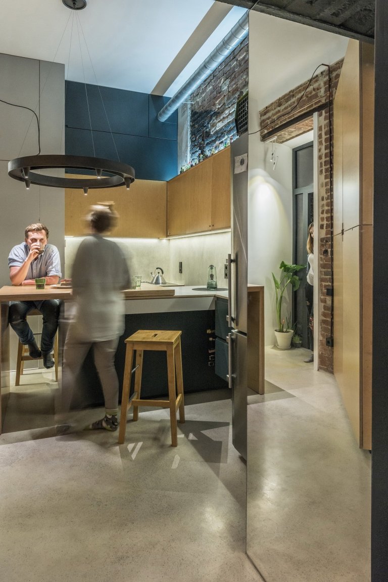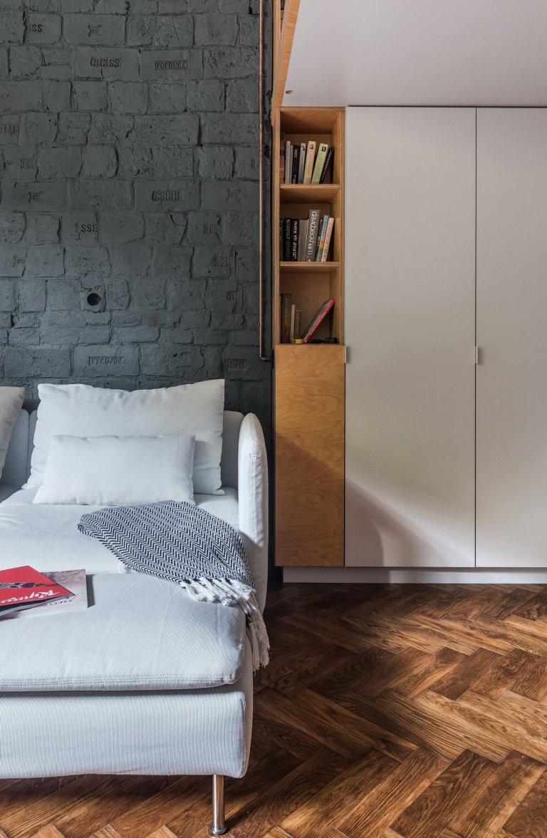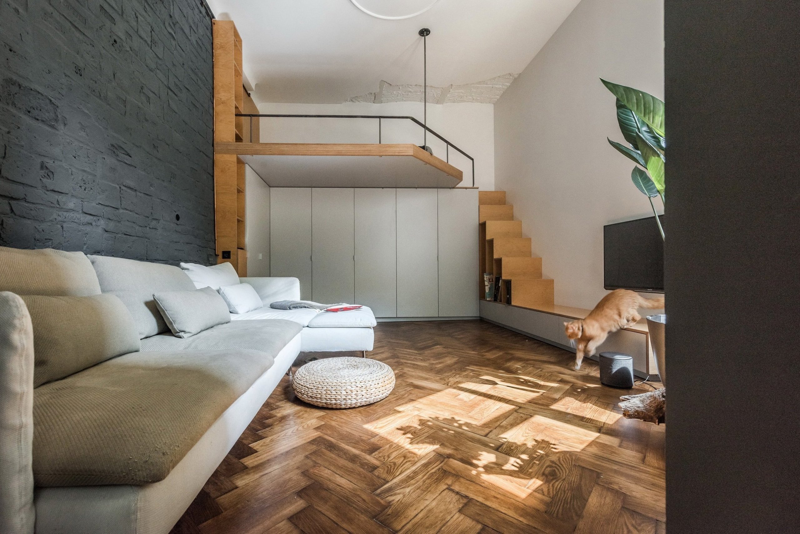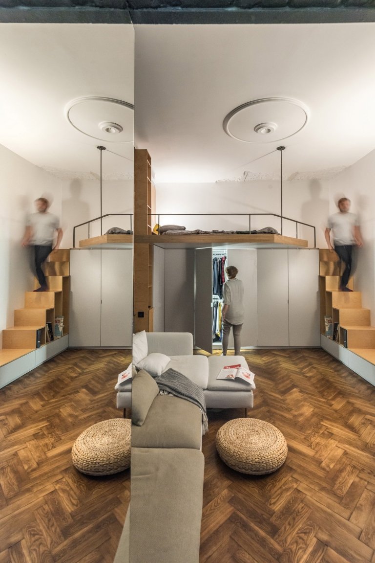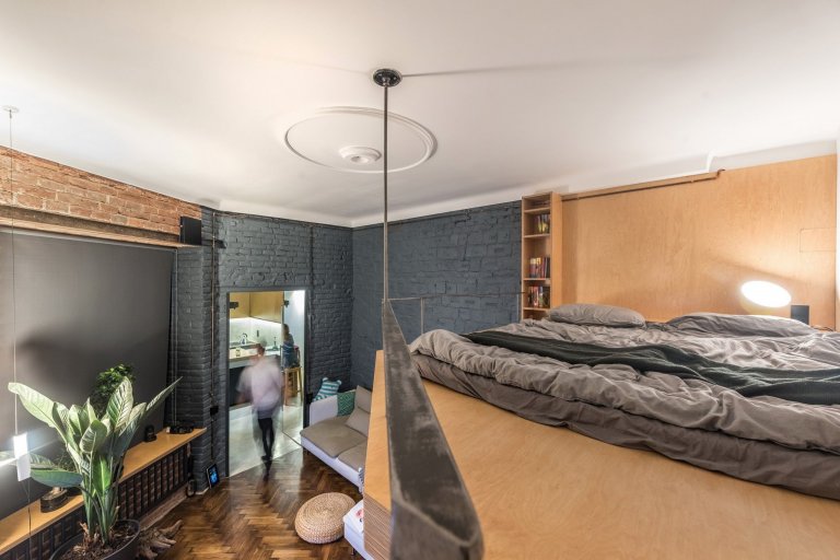 Cílem designérů bylo na základě představy majitelů vytvořit z nevyhovujícího prostoru pravý opak: moderní byt, který by využil každý centimetr. Malá kuchyň s ostrůvkem vyhovovala potřebám domácích. Vše ostatní řeší jeden pokoj. Tu architekti rozdělili do tří funkčních zón. V hlavní je pohovka se stolkem a televizí, další tvoří postel umístěna do výšky. Pod ní vznikl odkládací prostor a šatník.