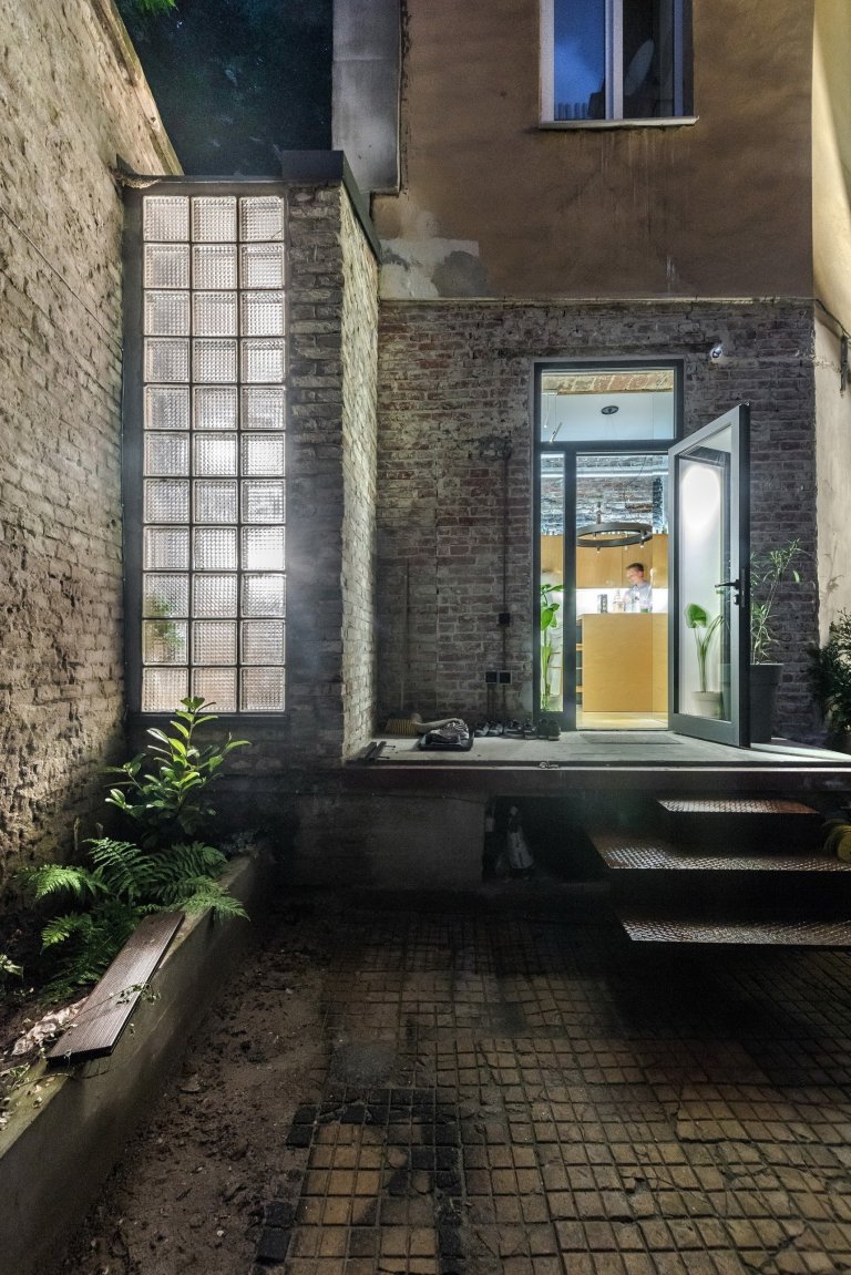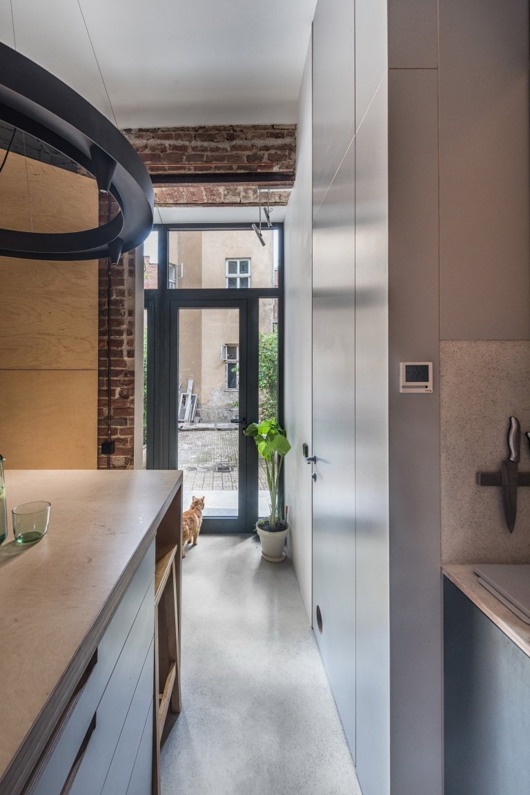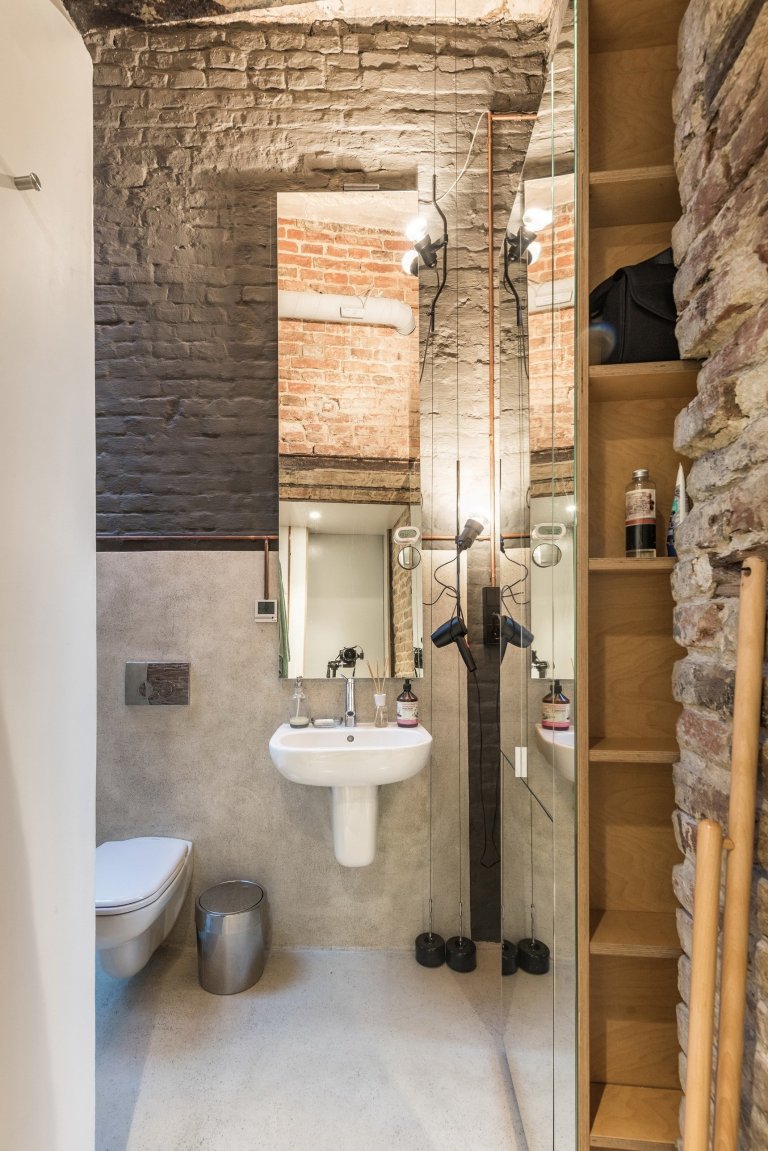 Hlavním materiálem, se kterým designéři pracovali, byla laminovaná překližka. Neméně důležitou roli v bytě hrají zrcadla, které prostor nejen opticky zvětšují, ale i prosvětlují. Rekonstrukce odstranila všechny nánosy minulosti a na mnoha místech ponechala obnažené zdivo, dokonce i potrubí. Tento moment nejpůsobivější vyznívá v koupelně, zajímavě je zdivo zvýrazněno i v jediné obytné místnosti, kde je natřené tmavě šedou barvou. Každý kus nábytku byl vyroben přesně na míru, aby do prostoru padl jako ulitý. Ze starého bytu se podařilo v pokoji zachovat staré rakouské parkety, hrající všemi odstíny hnědé.