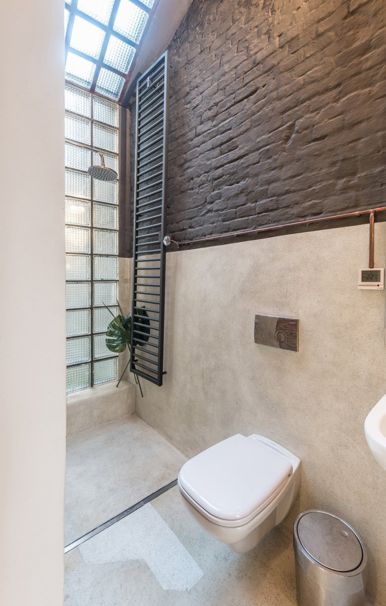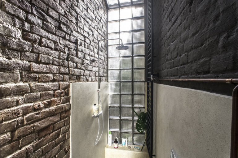 Příjemným prostorem je velká sprcha, do které vniká přirozené světlo díky luxfer. Z nich je vytvořena nejen část zdi, ale i střecha nad sprchovým koutem a toaletou. Dodává nové stavbě bytu punc jedinečnosti a hygienickou místnost nabíjí pozitivní energií.