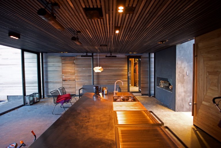 Kabiny jsou vyrobeny ze dřeva s vnějším obložením z cedrového dřeva, které bylo ošetřeno síranem železa, díky čemuž se dosáhlo rovnoměrné patiny. Hlavní plochy jsou jako kontrast tvořeny z jiného dřeva, kterým je převážně dub. Podlaha v každé místnosti je dělána tak, aby zapadala do konečného vzhledu. Stropy tohoto domu jsou zhotoveny z dubových lamel, které jsou ošetřeny tak, aby byly v některých místech o něco tmavší než jinde.