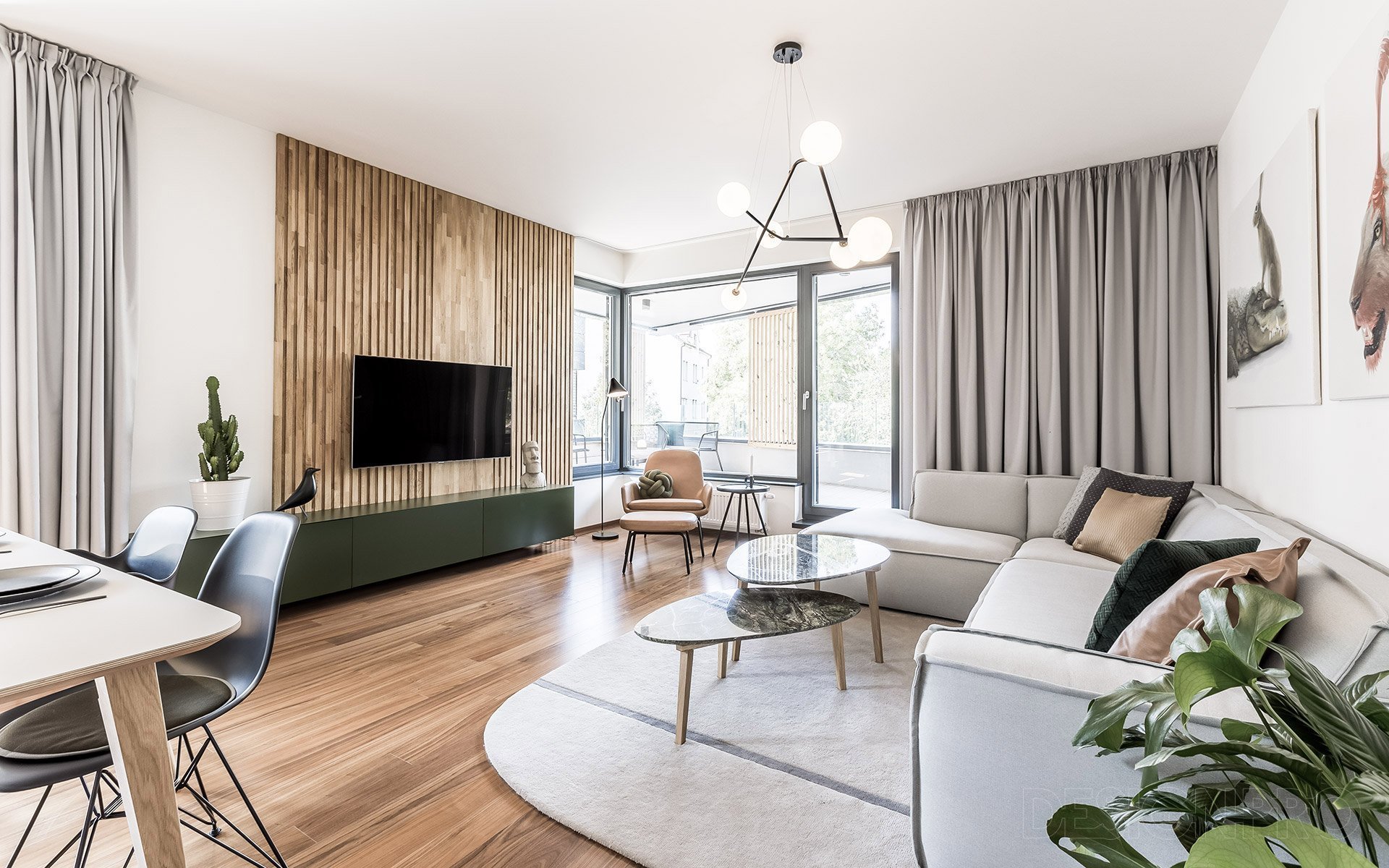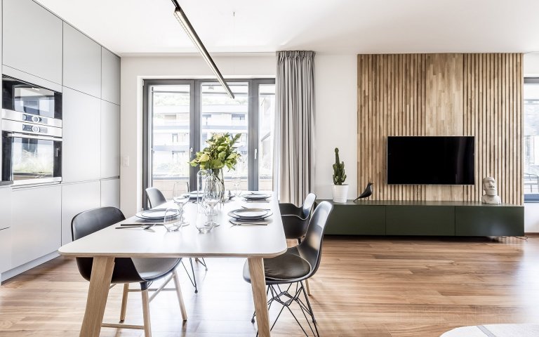 Celý interiér bytu je laděn do tmavších barev; jak si můžeme všimnout, prim zde hraje zejména kombinace šedé a černé barvy, které tvoří dokonalý kontrast ke dřevěné podlaze a nábytku. Byt ze dvou stran lemuje velká krytá terasa plná zeleně, kdy na terasu můžeme vstoupit ze všech pokojů v bytě.