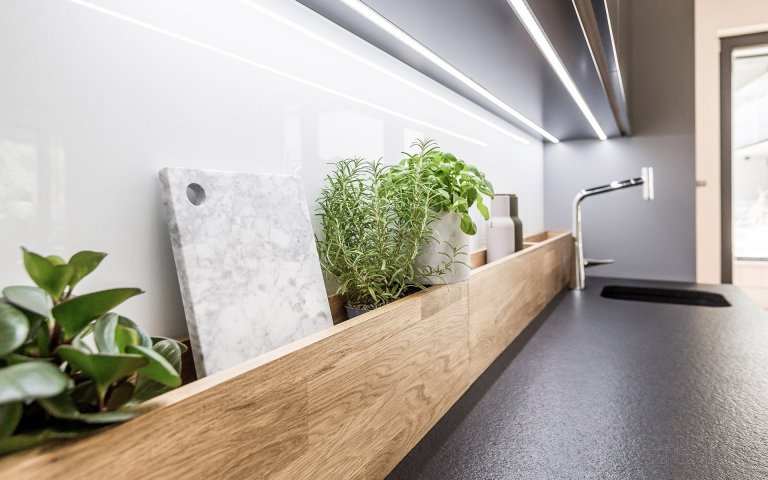 V kuchyni byla navržena pracovní deska ve větší hloubce, aby za skříňkami vznikl prostor vhodný pro vedení nových instalací bez potřeby zasekávání nových rozvodů. Na pracovní ploše se nachází dřevěný truhlík, ve kterém jsou ukryty elektrické zásuvky a prostor pro umístění kořenek či bylinek. Chytré úložné prostory jsou i v chodbě, kde jsou skříně skryté v nice.