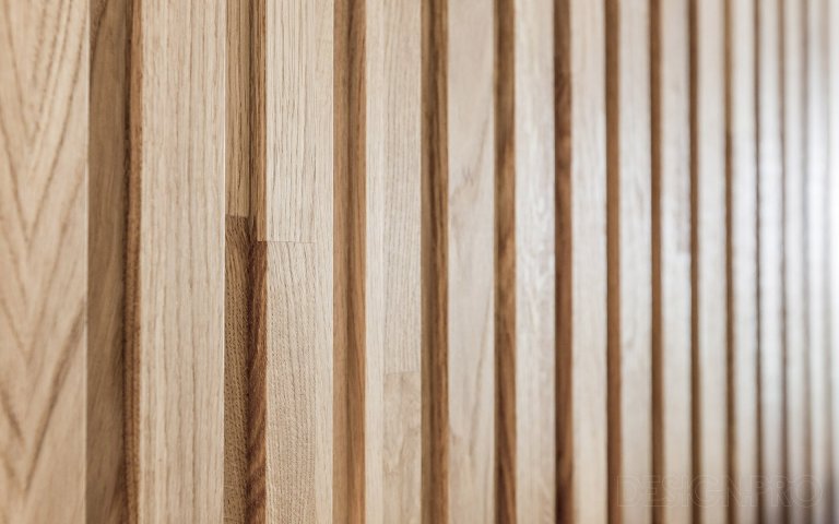 Jako doplňkové stínění celého bytu architekt použil dřevěný pojízdný lamelový rošt. Záměrem architektů studia DesignPro bylo maximální propojení interiéru s exteriérem. Proto na exteriérové rošty v interiéru navazují dubové obklady ve všech místnostech, aby se oba prostory spojily co nejvíce. V pánské pracovně byl obklad namořen na černo, aby se zde zachovala atmosféra pánského ducha. Jako doplňková barva byla zvolená tmavě zelená.