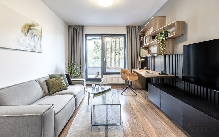 Byt nacházející se v pražské Michli, jenž byl součástí developerského projektu, se měl stát dočasným bydlením pro mladý pár, který zde chtěl bydlet do doby, než se rozhodne založit rodinu. Právě proto architekti místo dětského pokoje vytvořili pásnkou pracovnu. A tak vzniklo příjemné bydlení plné nadčasových kousků a barev, které si pár oblíbil natolik, že pravděpodobně další stěhování nebude potřeba.