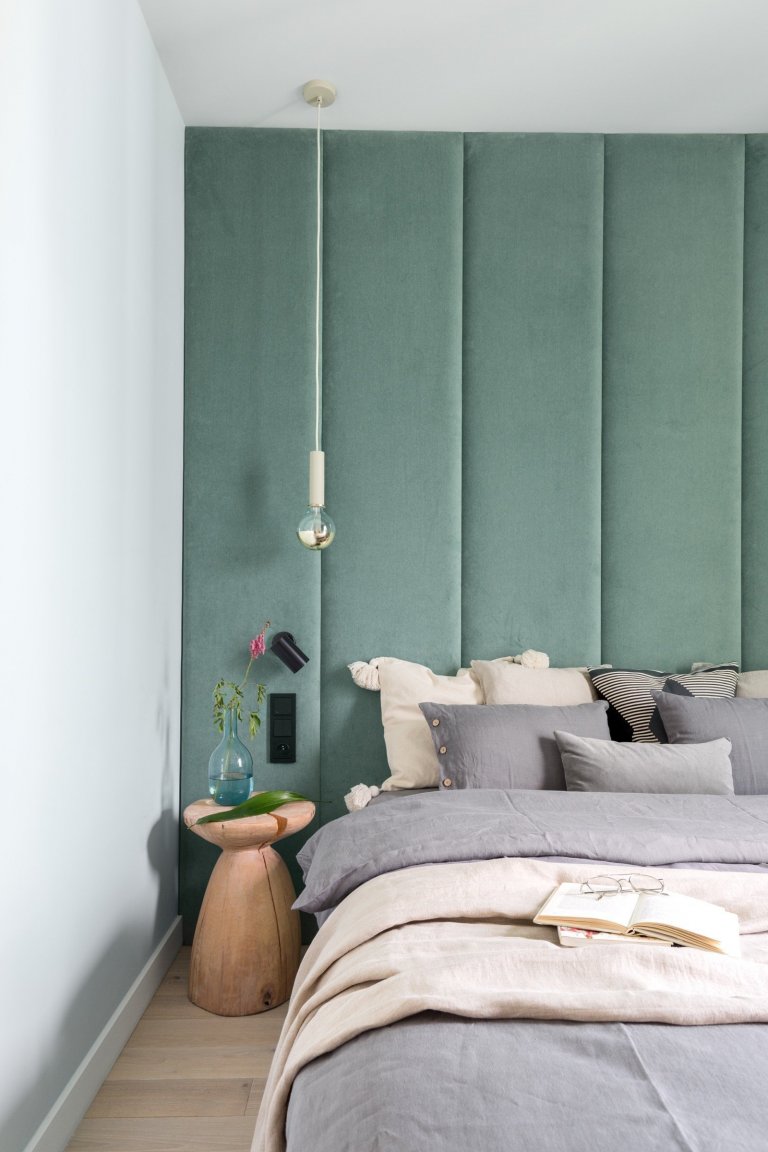 Ložnice působí velmi útulně, díky obložení stěn čalouněnými panely (na zakázku) a přítomnosti záclon. Vybavení ložnice je velmi jednoduché, ale hojnost tkanin, kontrast mezi tyrkysovým odstínem a dřevěným nočním stolkem stolem vytváří klidnou atmosféru, která je ideální právě pro ložnici. Protože mladí majitelé jsou zvyklí číst si v posteli, praktické pohyblivé lampičky byly nutností.