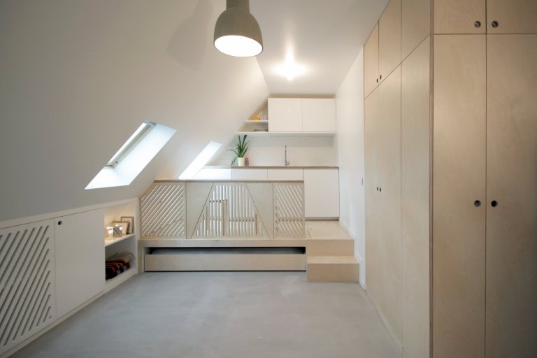 Původní podkrovní pařížský byt o rozloze 15 m2 působil nepříliš svěžím dojmem nejen proto, že byl zastaralý svým vybavením, ale hlavně se mu nedařilo plně využít všech dispozic, které se tu nabízely k docílení toho, aby prostor inteligentně a funkčně pracoval s úložnými prostory a stavebními možnostmi. To se naopak dokonale povedlo pařížským architektům z designerského studia Batiik. Ti díky několika stavebním úpravám vykouzlili i na tak skromné ploše dostačující moderní a útulné bydlení pro dva.