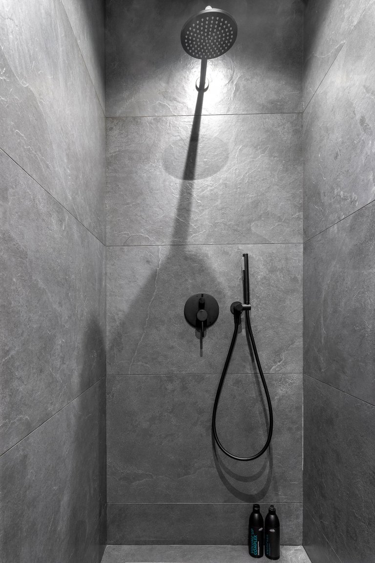 Výklenek s regály, parapety a pracovní deska v ložnici byly vyrobeny z překližky o tloušťce 35 mm a jsou natřené tmavě šedou barvou. Koupelna je čtvercová, ve středu je přepážka oddělující prostor s umyvadlem a toaletou od sprchy. Sprchový kout byl vyroben bez dveří a bez vaničky: v podlaze je upraven svah a je zabudována skrytá lávka pro vypouštění vody. Po demontáži zůstal v koupelně poměrně hluboký výklenek ze starého otvoru. Toto prohloubení umožnilo skrýt toaletu ve zdi a vytvořit výklenek pro kotel, filtry, měřič a kolektor. Podlaha a stěny koupelny jsou obloženy černým břidlicovým porcelánem. Cihlová klenba je řešena stejným způsobem jako v celém bytě: je vyčištěna, pokryta ochrannou vrstvou a natřena omyvatelným nátěrem.