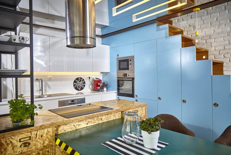 Dominantním prvkem bytu je atypicky řešená kuchyně. Linka je vyrobena z bílého Senosanu, pracovní deska zase z Technistonu. Schody v této místnosti v sobě skrývají vysoké skříňky. Jídelní stůl v industriálním stylu je uchycený do kuchyňského ostrůvku, vyroben je z lakovaných OSB desek, kde jeho druhý konec drží zavěšený na konstrukci krovu ocelovými lanky.