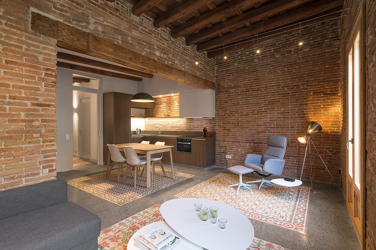 Návrhu rekonstrukce se ujali architekti ze studia FFWD ze Španělska. Byt se nachází v Barceloně, ve čtvrti Eixample. Odkrytá katalánská dlažba dala architektům jasný směr, kterým se při návrhu řídili. Propojení původních historických prvků se současnými, bylo při řešení designu interiéru stěžejní. Cihlové stěny byly očištěny, stejně jako dřevěné trámy na stropě a staly se naopak chloubou celého bytu.