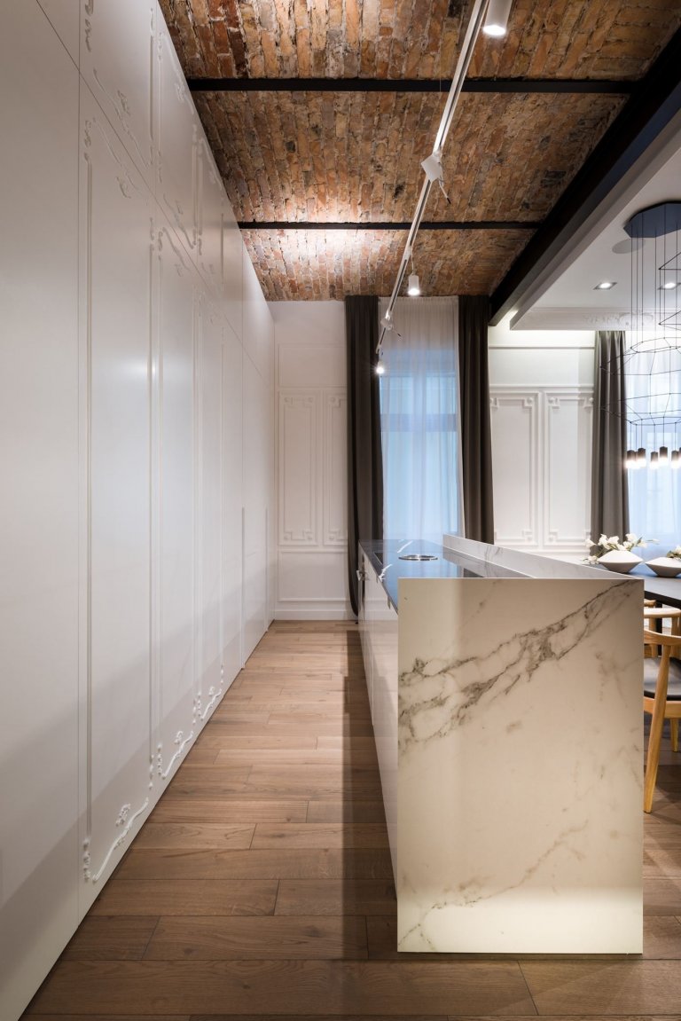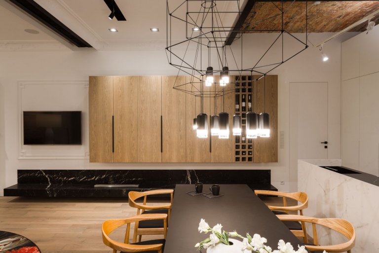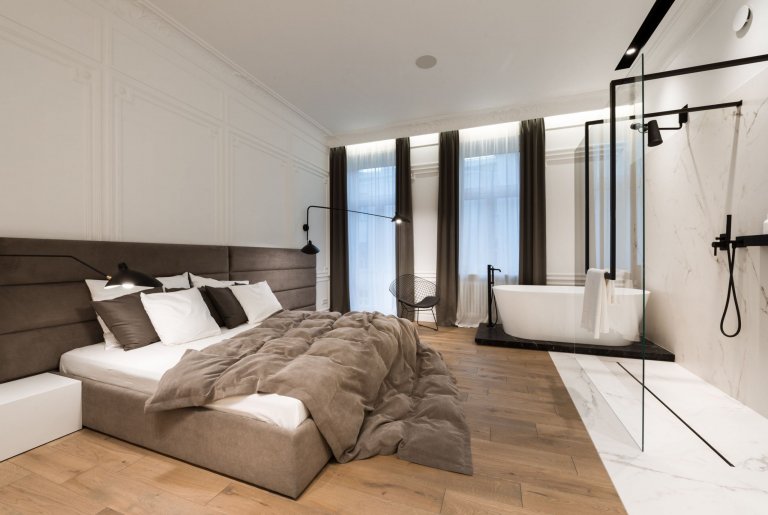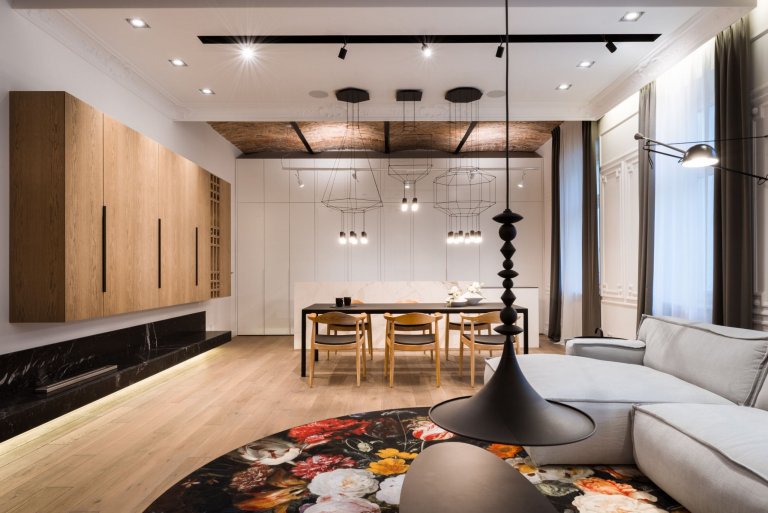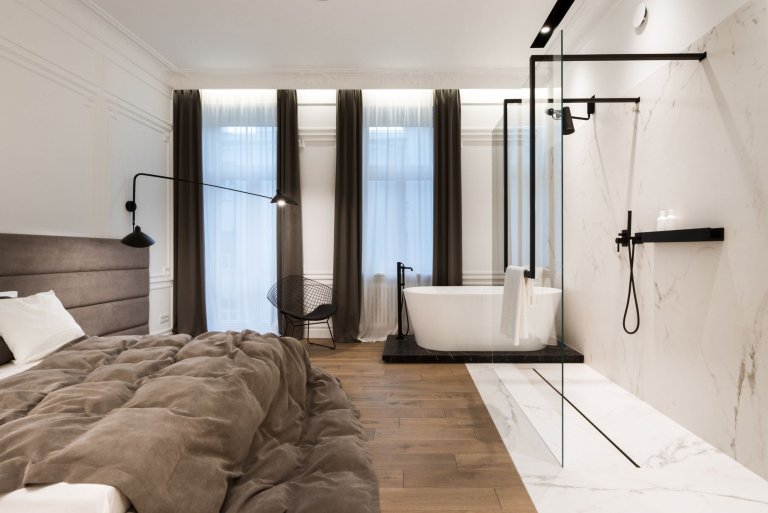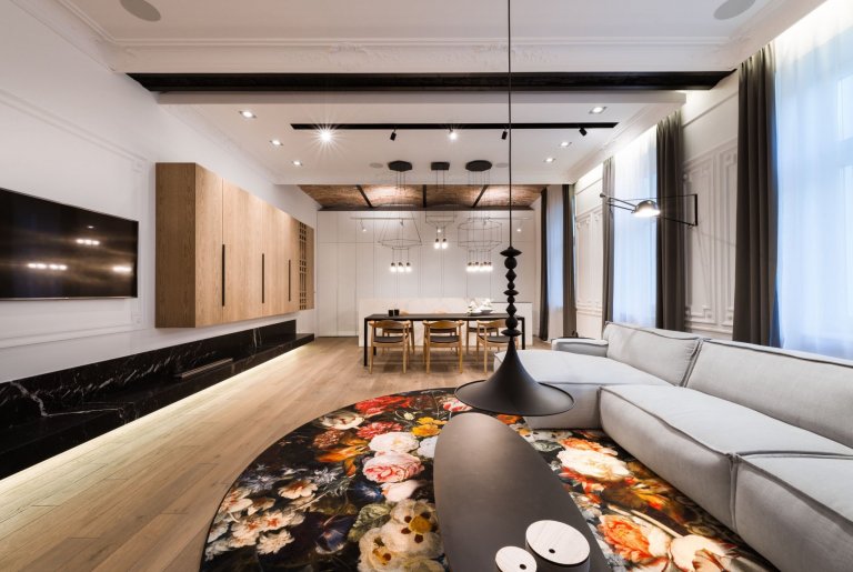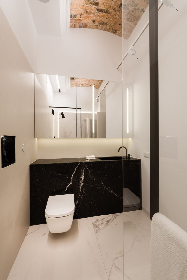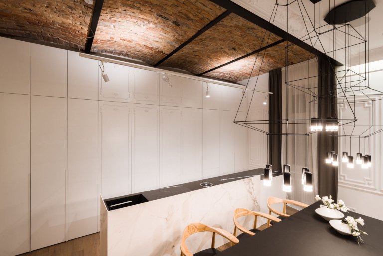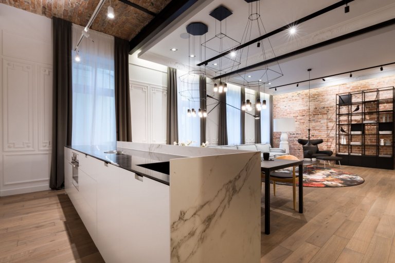 Díky svědomité práci bytových architektů plné fantazie vzniklo v historickém činžovním domě minimalistické bydlení, které nejen díky mramoru a impozantním lustrům získalo tak přitažlivý dotek luxusu. Bydlení, na které mohou být jeho majitelé právem hrdí.