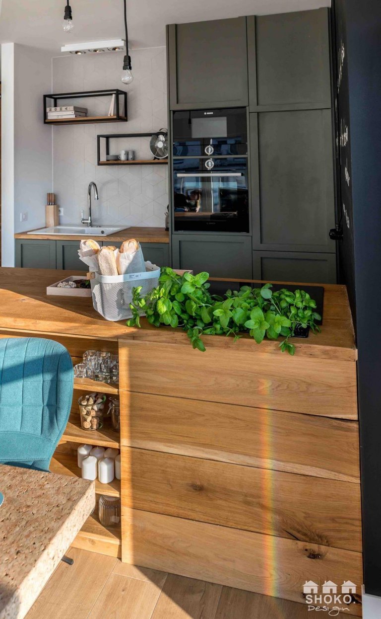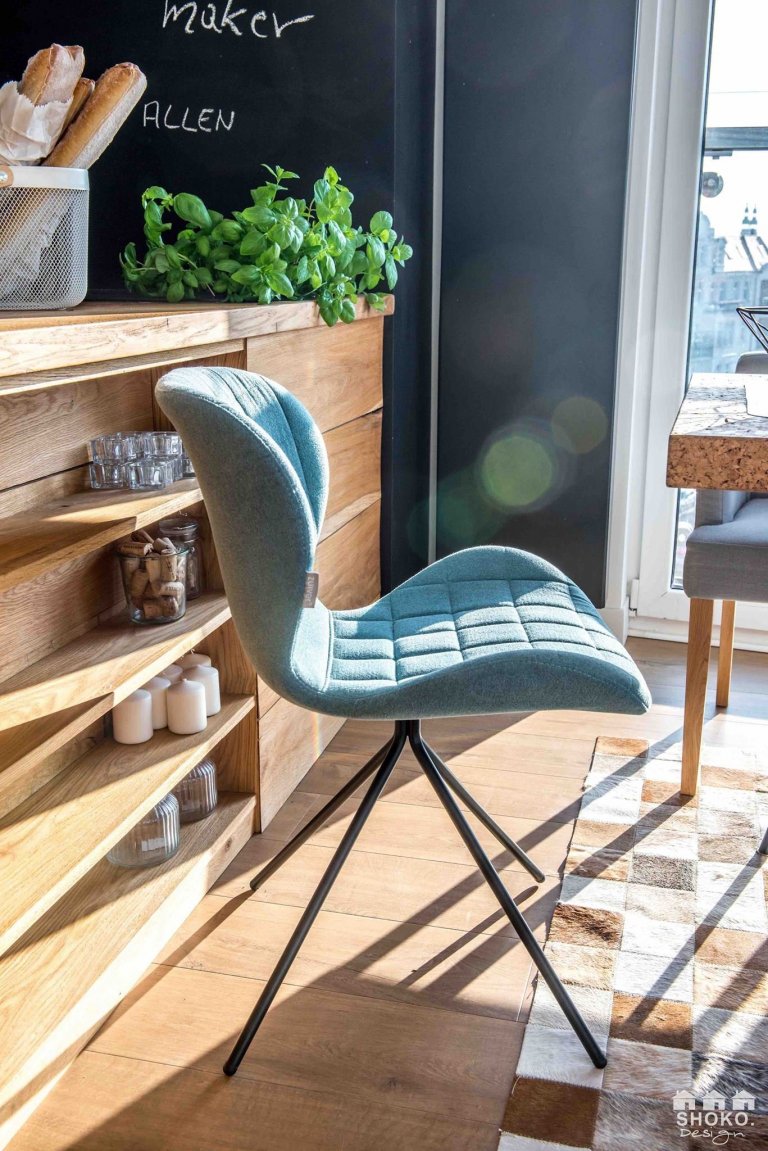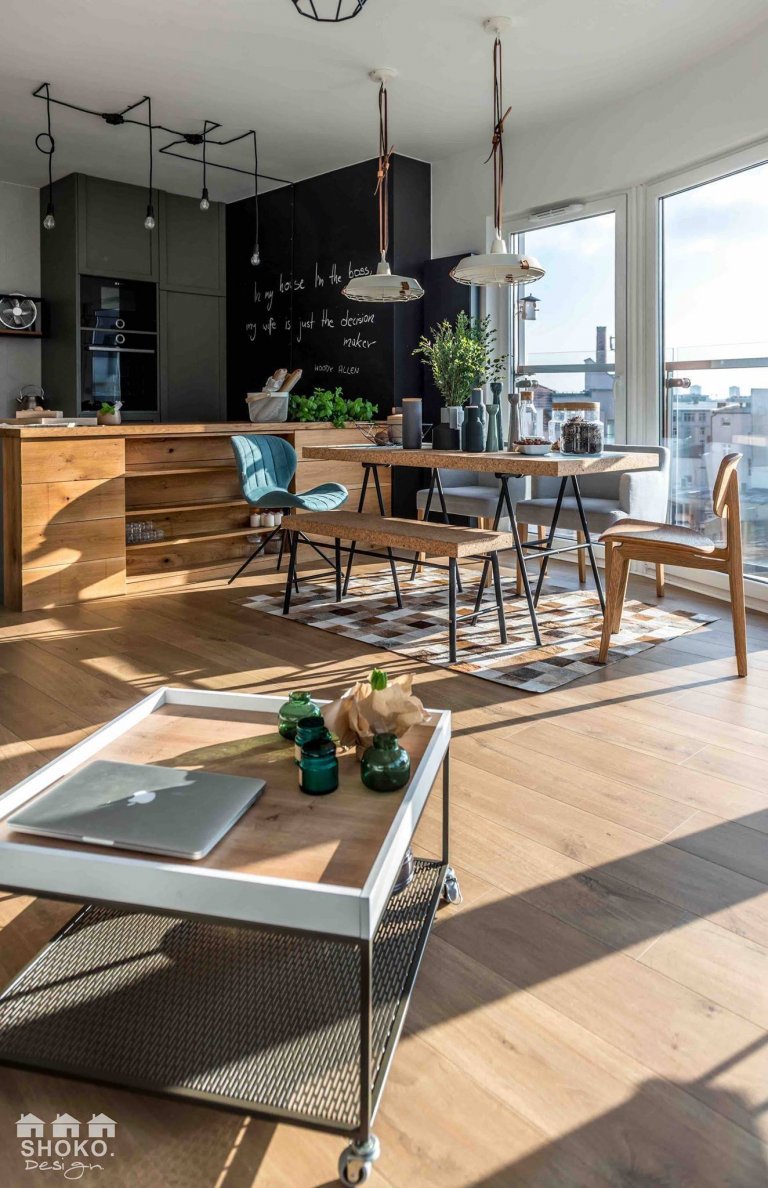 Když novomanželé hledali svůj vysněný byt, apartmán o ploše zhruba 55 metrů čtverečních i s terasou byl pro ně od prvního okamžiku jasnou volbou, a to především díky prostornému obývacímu pokoji s dechberoucím výhledem. Jediné, s čím si nevěděli rady, bylo to, jak uspořádat byt co nejdokonaleji, jelikož před začátkem stavebních úprav byly všechny místnosti odděleny a uspořádány kolem vstupní haly. A právě to chtěli majitelé změnit a celkový prostor více otevřít, a tím zároveň opticky zvětšit i místnosti. Na pomoc si přizvali designéry ze Shoko Studia, kteří přišli s návrhem, který přesně odpovídal jejich představám, totiž aby se kuchyně stala součástí obývacího pokoje a pouze díky nábytku došlo k oddělení dvou různých funkčních prostor. Maličká kuchyně je rozšířena o poloostrůvek a z praktických důvodů je kuchyňská stěna natřena černou tabulovou barvou, protože nad varnou deskou chybí digestoř.
