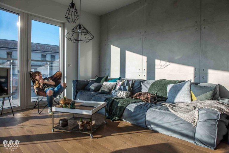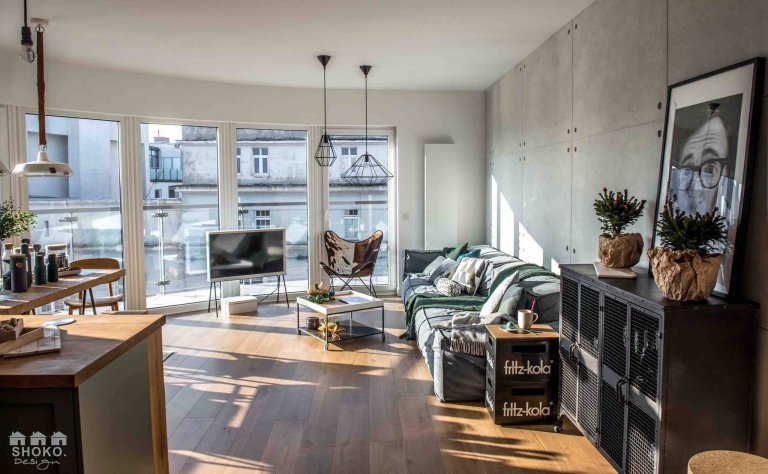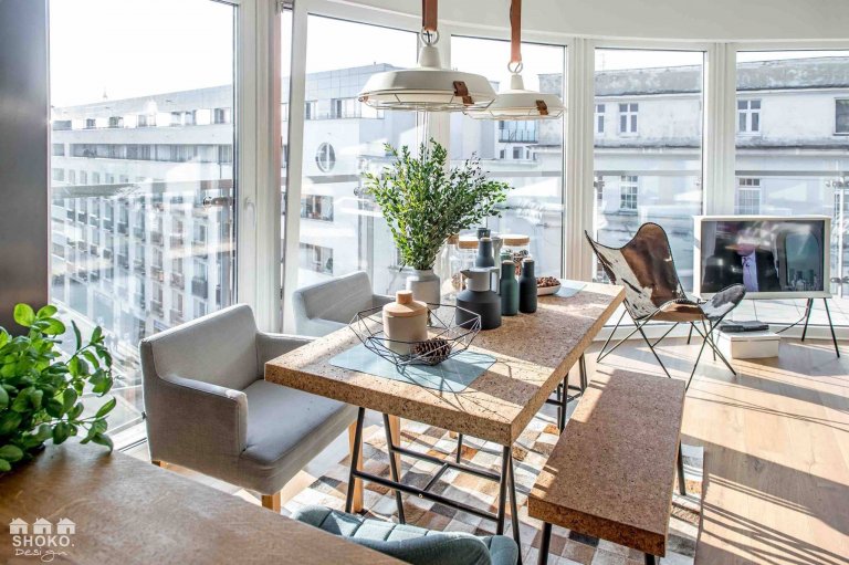 Tento sympatický moderní polský byt, ve kterém žije mladý novomanželský pár se psem, na první pohled upoutá úžasně prostornými okny, díky nimž je celý apartmán naplněn enormním množstvím světla a která navíc umožňují ojedinělý panoramatický výhled na město.