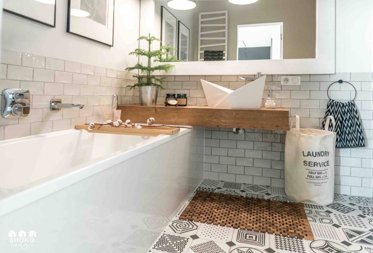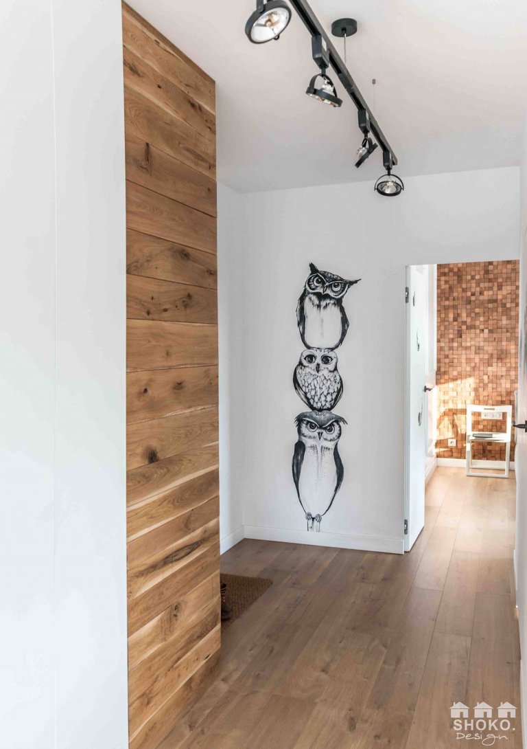 Interiér oplývá spoustou zajímavých prvků, které mají zásadní vliv na tom, že celková atmosféra bytu působí příjemně a je z ní cítit mládí a hravost. K nejpozoruhodnějším prvkům patří bezesporu zeď za hlavou postele v ložnici tvořená mozaikou z drobných dřevěných kostek, která dodává místnosti na útulnosti a působí velmi měkce. Koupelna překvapí využitím dřeva u pultíku, na kterém dominuje umyvadlo ve tvaru origami papírové lodi. Prostor koupelny je poměrně štědrý a disponuje vanou i sprchou. V celém bytě vyjma koupelny jsou použity stejné parkety a objevuje se tu méně interiérových dveří (v ložnici je nahrazují posuvné dveře). Nepřehlédnutelnou roli hrají designová svítidla, která v sobě snoubí industriální syrovost v originálním provedení a poskytují jednotný vzhled celé domácnosti. Byt je příkladem vkusně provedeného skandinávského stylu, kde se snoubí moderní a přírodní prvky, které dodávají prostoru světlo a útulnost.