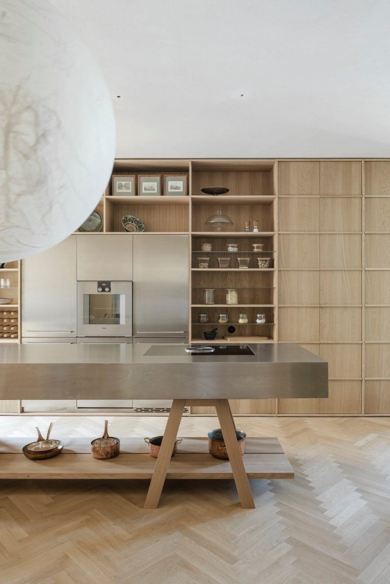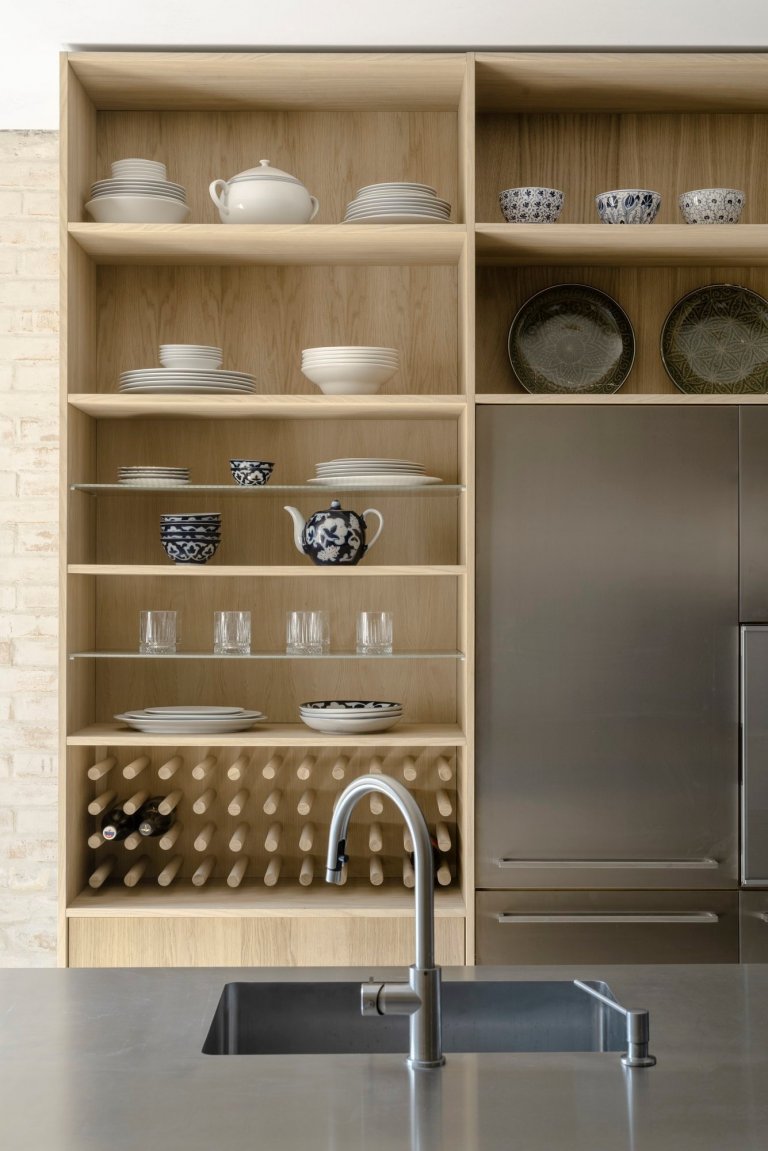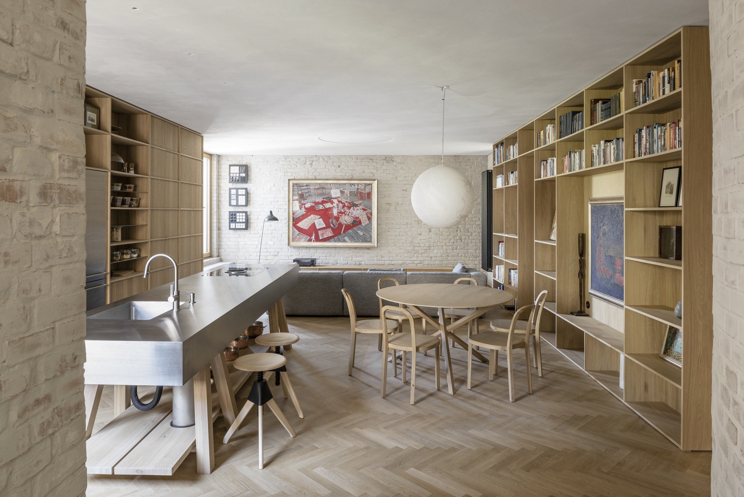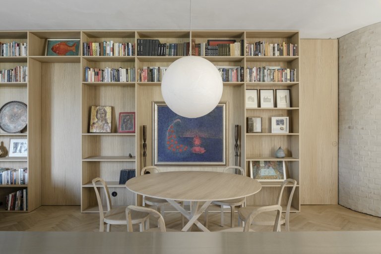 Soustředěním velkoryse pojatých úložných prostorů podél stěn může interiér bytu dýchat z plných plic. Místa pro knihy, obrazy i nádobí je tu víc než dost. A stejně tak i prostoru pro trávení zaslouženého odpočinku. Velká kuchyňská linka doplněná o z části odkryté a z části uzavřené úložné prostory působí jako galerie vystavující jednotlivé kusy nádobí. Přitom je ale i ryze praktická. Uvádí ji masivní kuchyňský ostrůvek, který opět disponuje praktickým i estetickým úložným prostorem. Tím překypuje i obrovská knihovna, jejíž jednolitost vystavených knih příjemně rozbíjejí prezentované obrazy, sošky a další pozoruhodná umělecká díla. U kulatého jídelního stolu tak vzniká příjemné zátiší plné inspirace a krásy minulých časů.