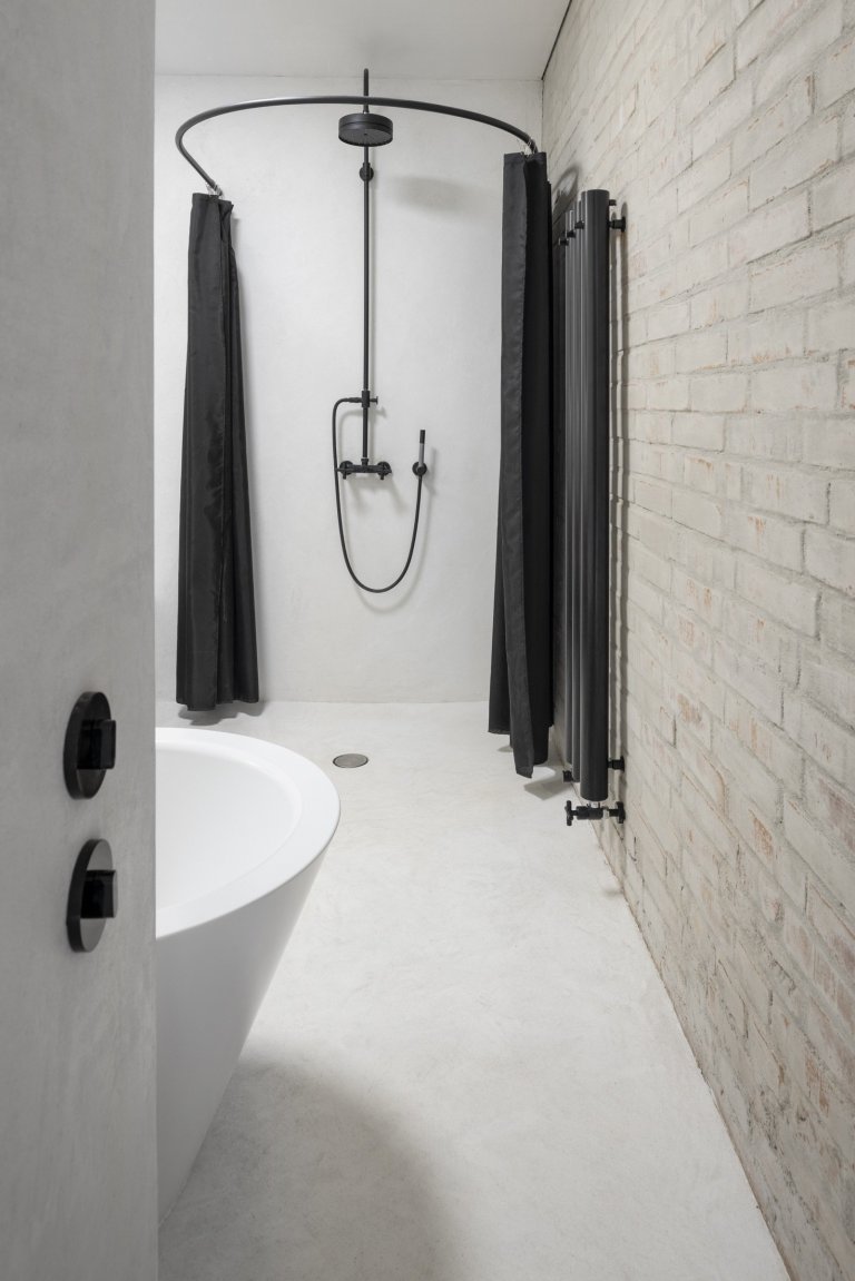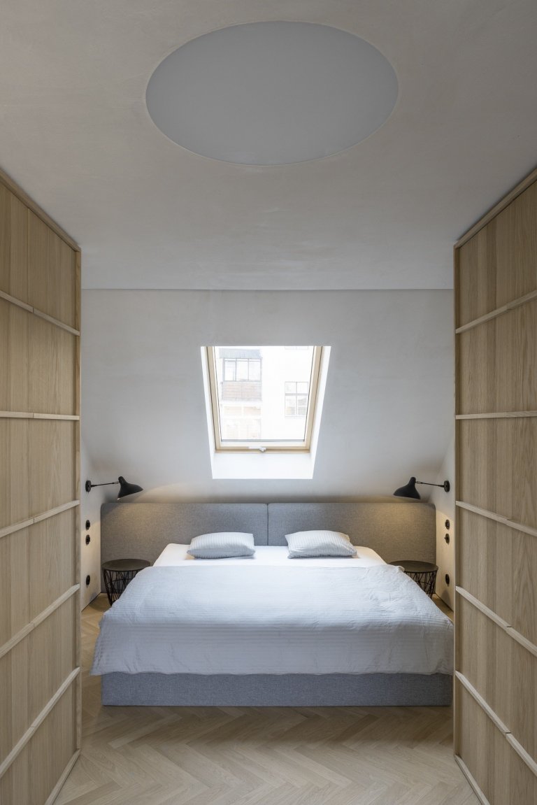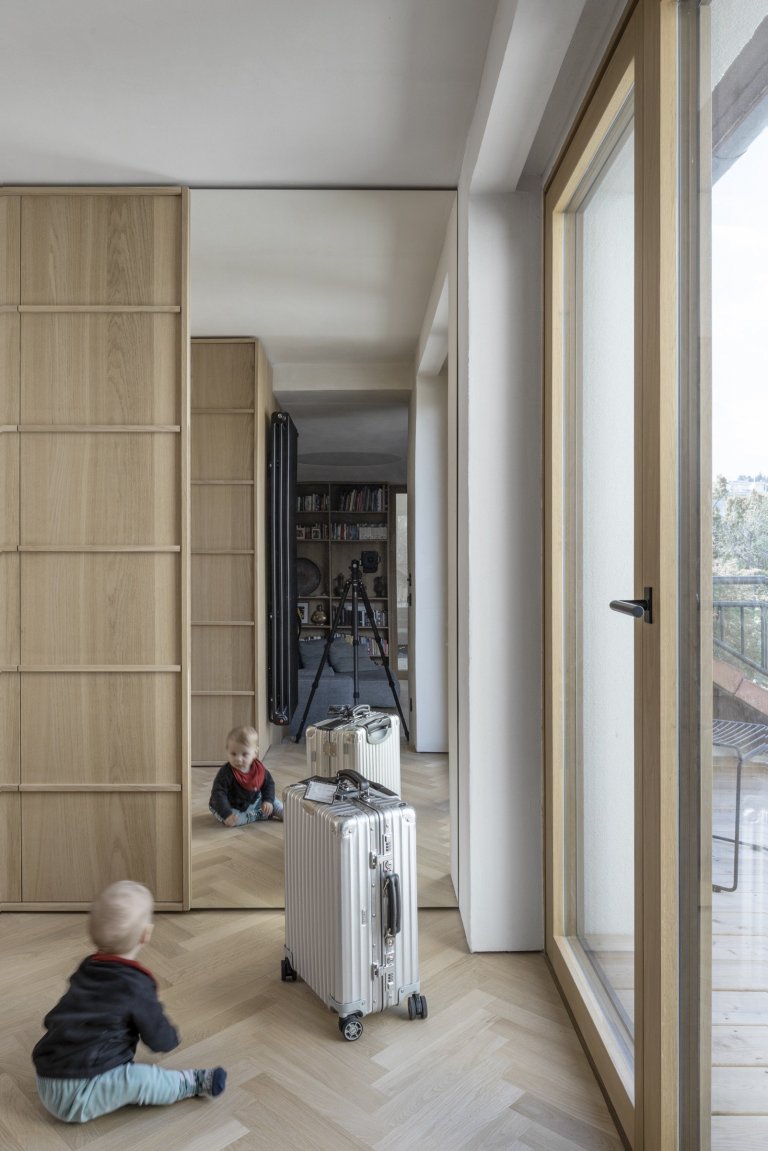 Specifikum tohoto bratislavského bytu netkví jenom v jeho původním účelu, ale také v tom, že se vlastně kdysi jednalo o byty dva. Ty však byly po přestavbě v 90. letech a nadstavbě křídla sousedního bytového domu spojeny do jednoho prostoru. Ze dvou malých bytů tak vznikl jeden o celkové ploše 100 m2, kterou ještě zvětšuje terasa. Ta se přitom spolu s ložnicí nachází na čtvrtém podlaží původně sousedního bytu, zatímco zbytek interiéru zaujímá podlaží třetí. Architekt Martin Skoček, který spolu s architekty Pavolem Dobšinským a Luciou Uhnákovou stojí za rekonstrukcí bratislavského bytu, k tomu říká: „I díky těmto skutečnostem bylo možné přemístit vchod do bytu tak, aby po kompletním vyčištění komplikované dispozice vznikl jeden centrální obytný prostor, na který jsou přímo bez zbytečných chodeb navázané prostory koupelny, samostatných ložnic a venkovní terasy.“