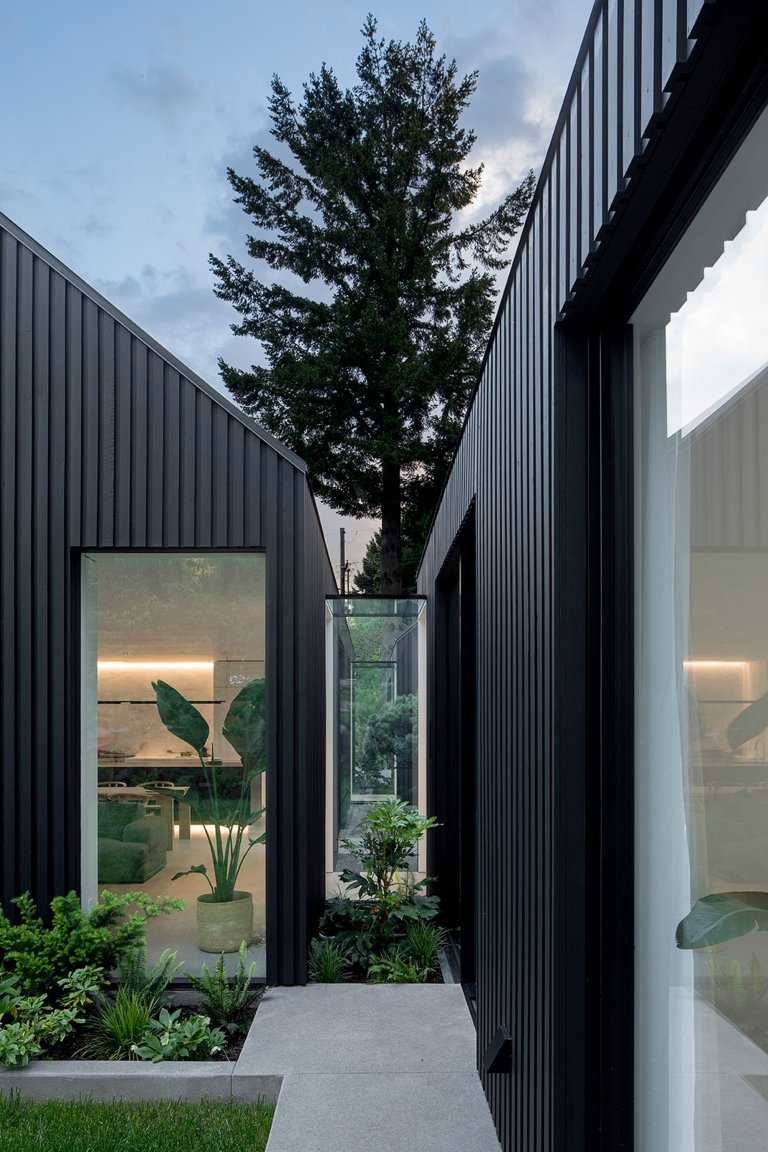Velká okna a četné průhledy zjemňují dojem ryze černobílého bydlení. Svěží zeleň je k vidění snad na každém kroku, díky čemuž je celé bydlení jakoby nabité energií. Hlavní prostory domu disponují velkými prosklenými plochami, které nabízí výhled do širé krajiny. Průchody mezi jednotlivými objemy jsou řešeny praktickým způsobem, který zaujme také svou estetickou stránkou. Tyto skleněné průchody dodávají celému komplexu na vzdušnosti a eleganci.