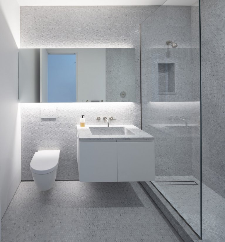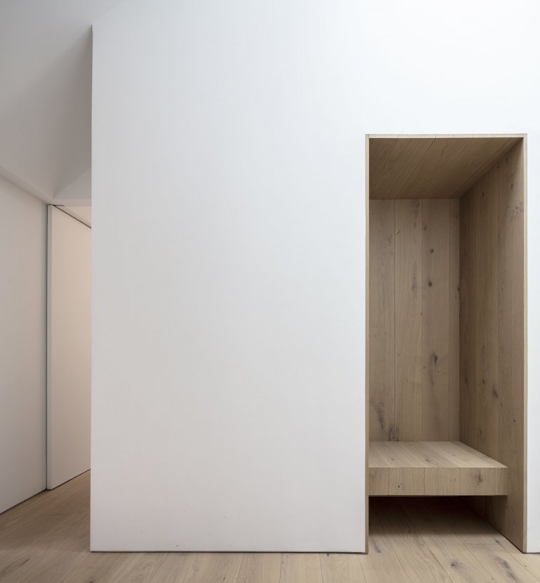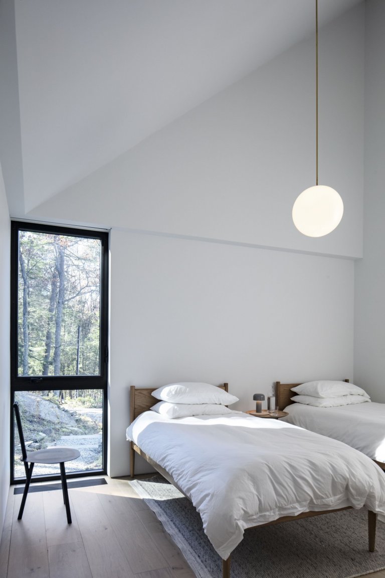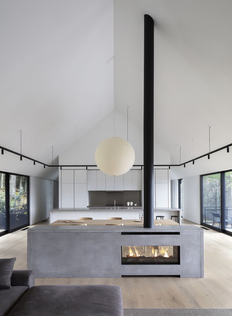 Pod přísně tvarovanou střechou je plynule uspořádán interiér domu. Ten je řešený tak, aby co nejméně blokoval výhledy do krajiny. V jednotlivých místnostech je kladen důraz na kvalitu materiálů a mix barev. Šedobílou paletu prohřívají světlé tóny dřeva a dramatizují četné černé akcenty. Celek pak osvěžují čarokrásné výhledy do přírody, která hraje řadou rozmanitých barevných kombinací. Majestátní dojem v interiéru vzniká díky vysokým stropům, minimalistickému stylu a převaze čistě bílé barvy. Četné výhledy a průhledy otevírají interiér do přírody a osvěžují tak vcelku konzervativní bydlení. I když jsou obyvatelé díky nepříznivému počasí nuceni trávit čas pouze uvnitř domu, nejsou tak odtrženi od přírody a jejích proměnlivých krás. Jakmile se vyčasí, mohou si užívat stolování a lenošení na stupňovité terase, která vede po celé délce domu, anebo přímo na zahradě. Zajímavý prvek v exteriéru představuje obrovský balvan stojící jako socha naproti společenským prostorům.