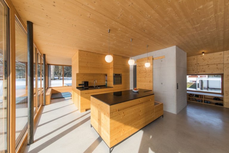 Spolu s domem architekti věnovali patřičnou pozornost i návrhu interiéru, kde jsou všechny skříně i kuchyňské vybavení vyrobeny také z odpovídajícího dřeva. Vyniká zde hlavně kuchyňská deska, která je z tmavého kamene. Kuchyně je místem, které zvolna přechází do zahrady. Od exteriéru ji totiž dělí pouze prosklená stěna.