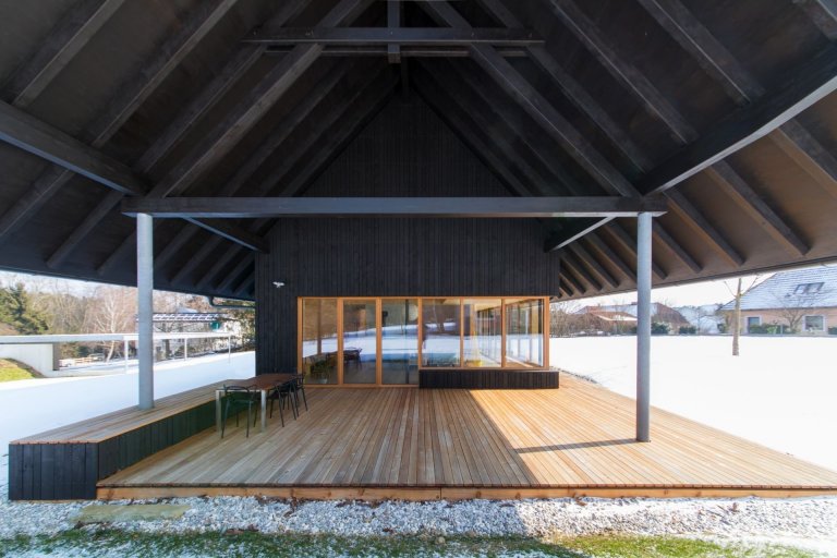 Výsledkem je dlouhý dům s dominantní střechou přesahující na terasu. Díky tomu vzniklo místo, kde může rodina sedět venku jak za parného sluníčka ve stínu, tak v suchu za deště. Severní strana domu má pouze jedno okno, jež je doplněno širokým vstupním výklenkem, v němž stojí starý rolnický stůl a dřevěná křesla. Jde o jakýsi přechod mezi exteriérem a interiérem.