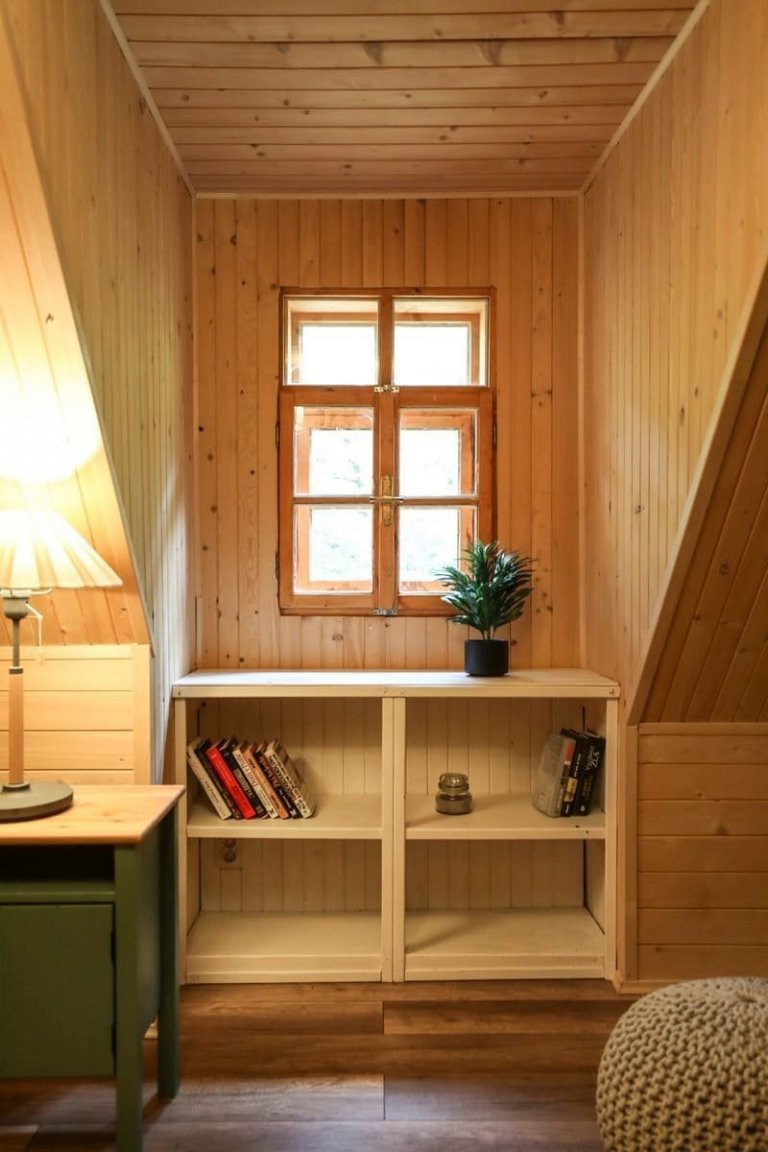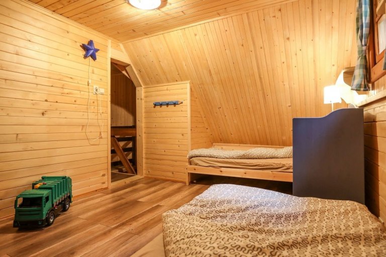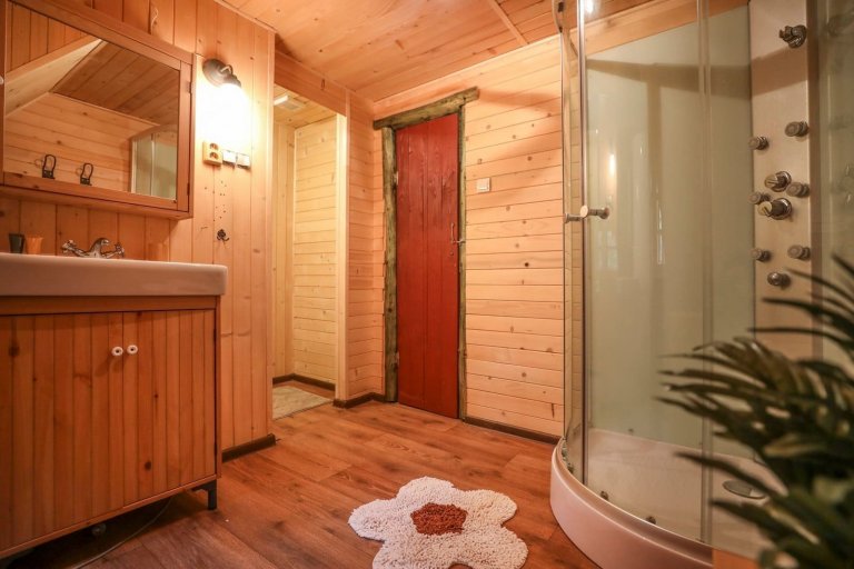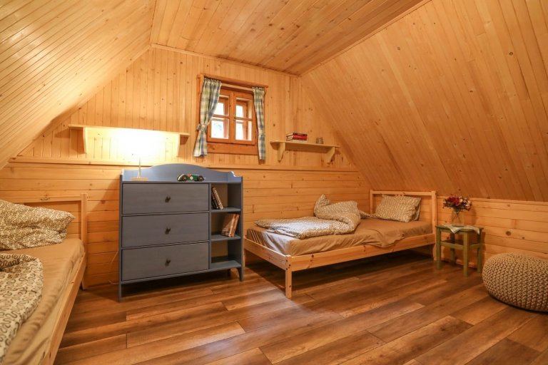 Příkladem může být modrá skříňka v jedné z ložnic, která si se světlými tóny dřeva hezky notuje. Interiér je tak útulný jak díky vhodným kombinacím materiálů, tak díky zvolené paletě barev. Účinně jej však prohřívá zejména přítomnost dřeva, ze kterého jsou podlahy i stropní trámy. Romantickou atmosféru v interiéru této nevšední chaloupky umocňuje také komfortní posezení, které je srdcem obývacího pokoje.