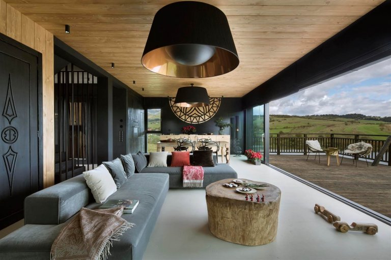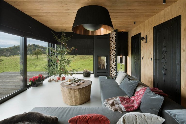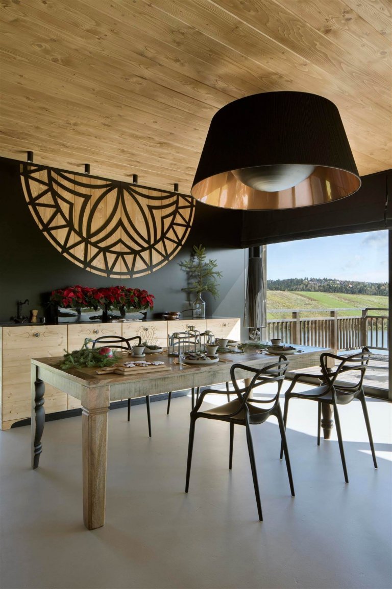V přízemí domu se nachází obývací pokoj, ze kterého je možné přejít na terasu bezprostředně ležící na břehu jezera. Místo televize pozorují majitelé z velké sedačky okolní krajinu. Díky pozemku bez oplocení tak jsou na dosah přírodě a místní zvířata na pastvě jim nakukují do oken. Nádherný výhled mohou majitelé pozorovat také od jídelního stolu. Masivní dřevěný stůl se zdobenými prvky kontrastuje s moderními designovými židlemi a černou výmalbou zdi.