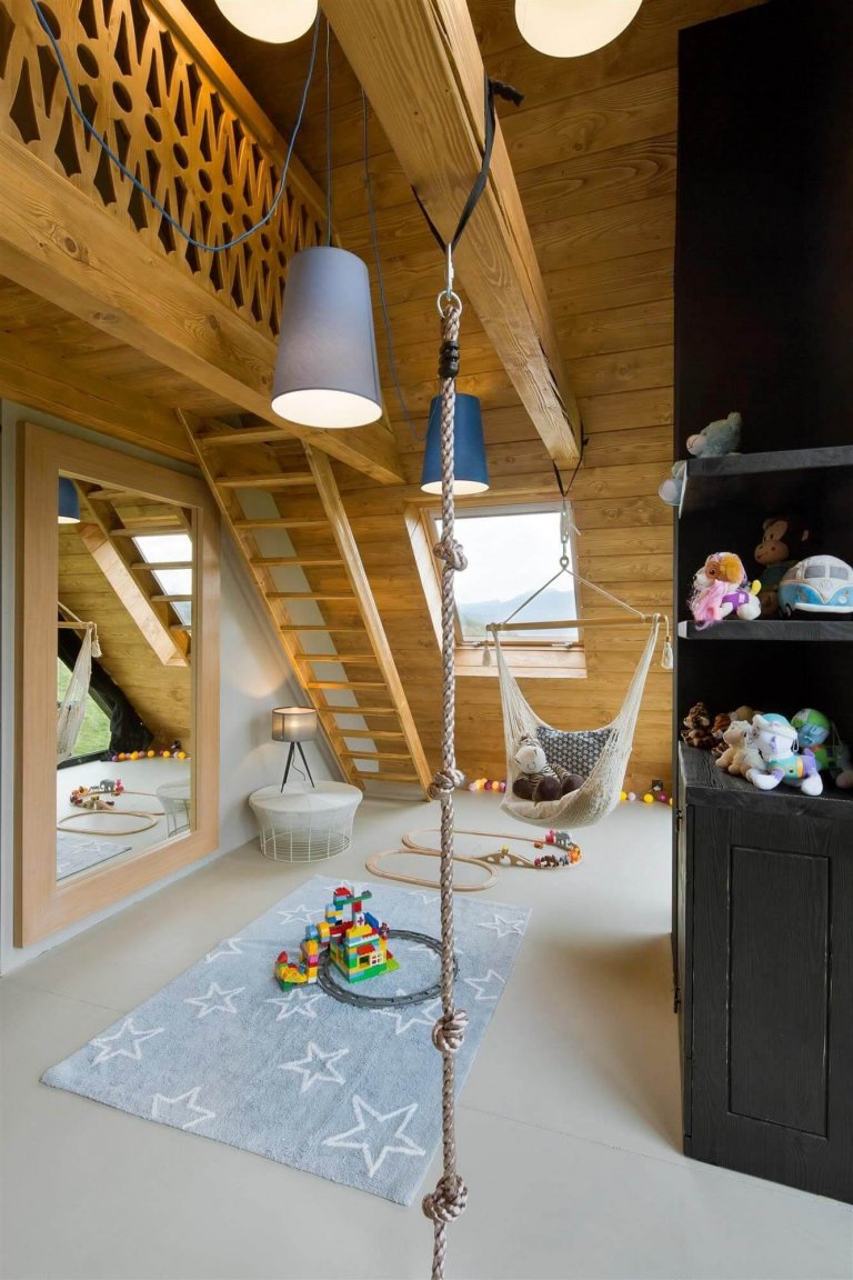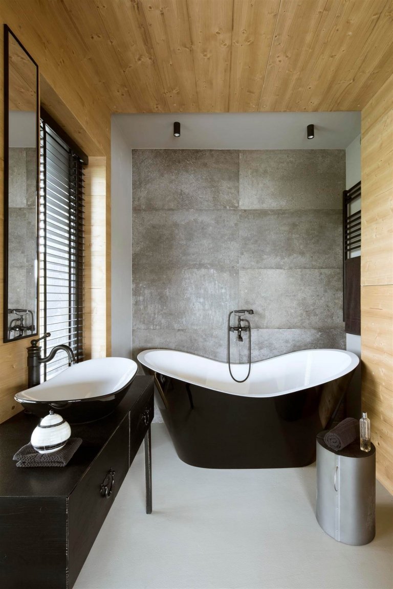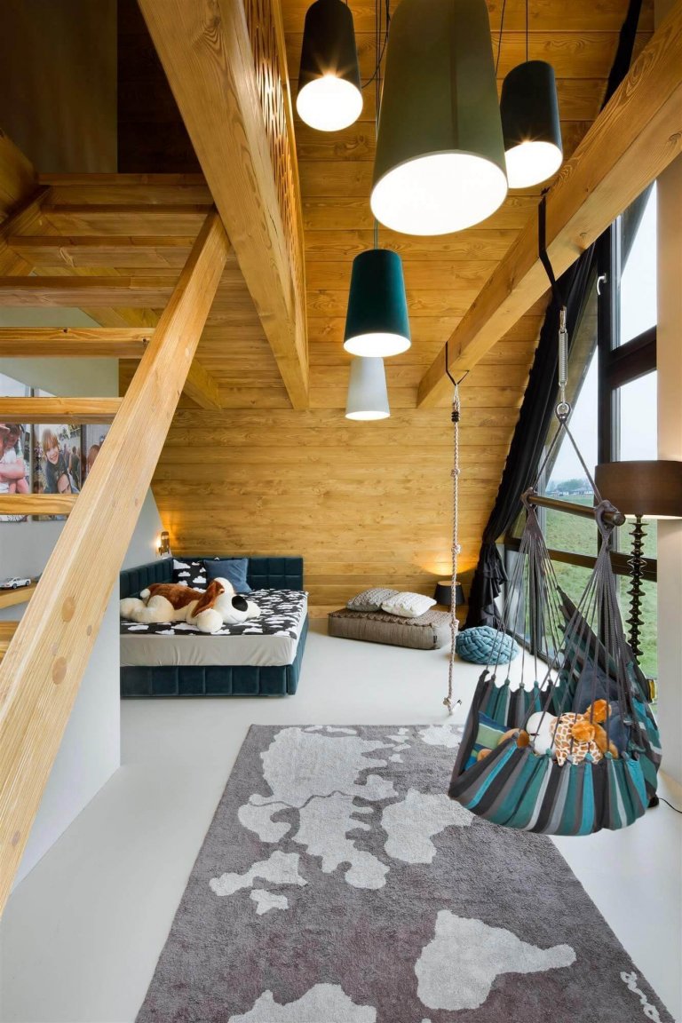 Pro snadný úklid je v celém interiéru použita litá podlaha a tvoří příjemný kontrast a odlehčení k dřevěnému obložení stěn a masivnímu nábytku. Hravost a neotřelé nápady se to zde jenom hemží. Posuďte sami. Líbí se vám?