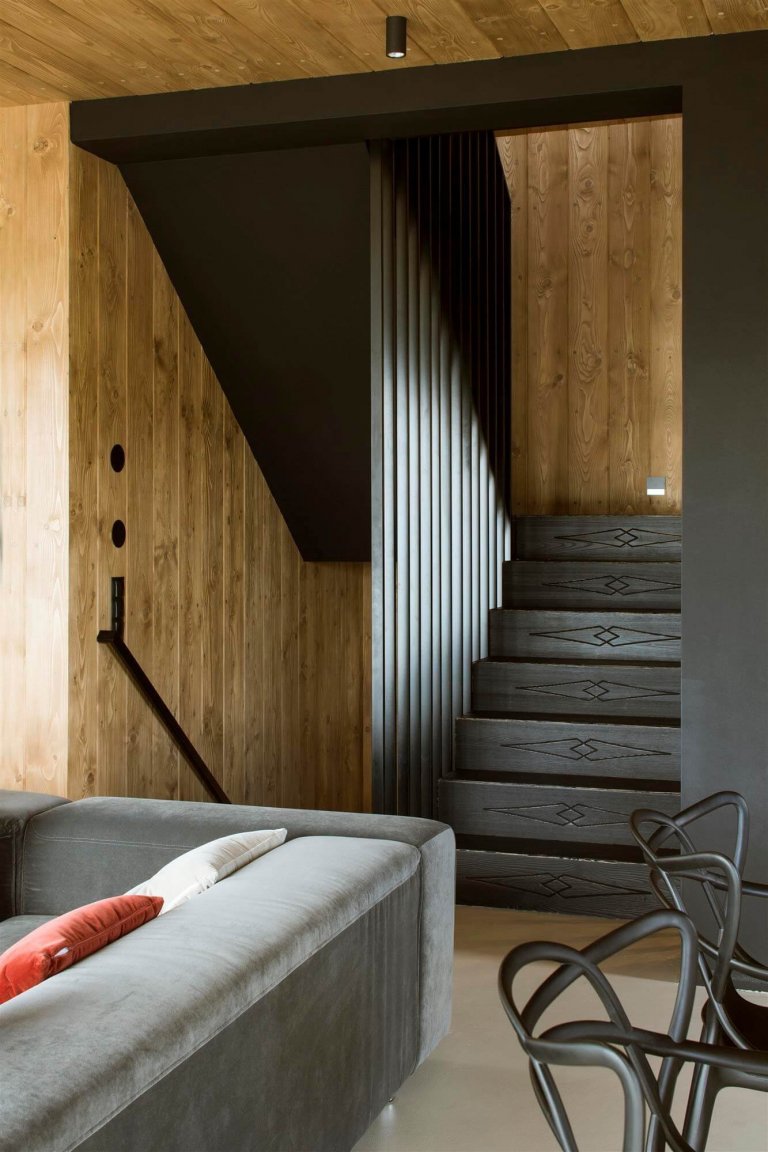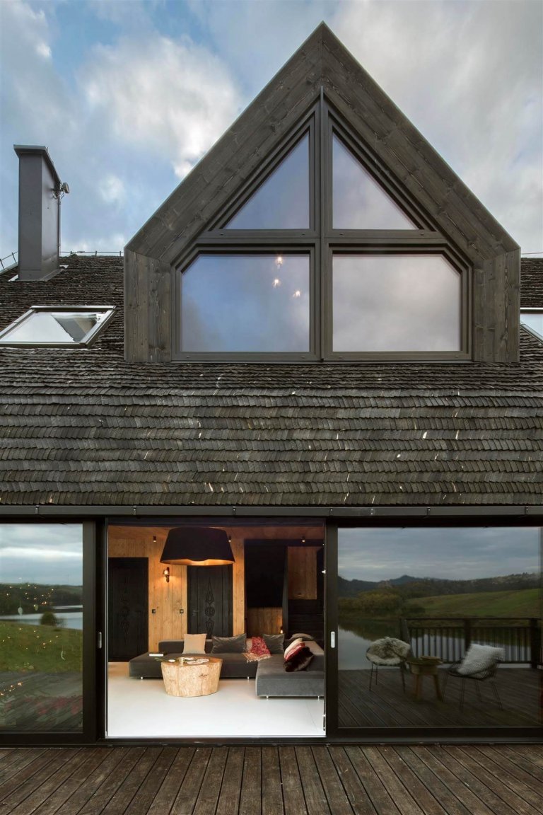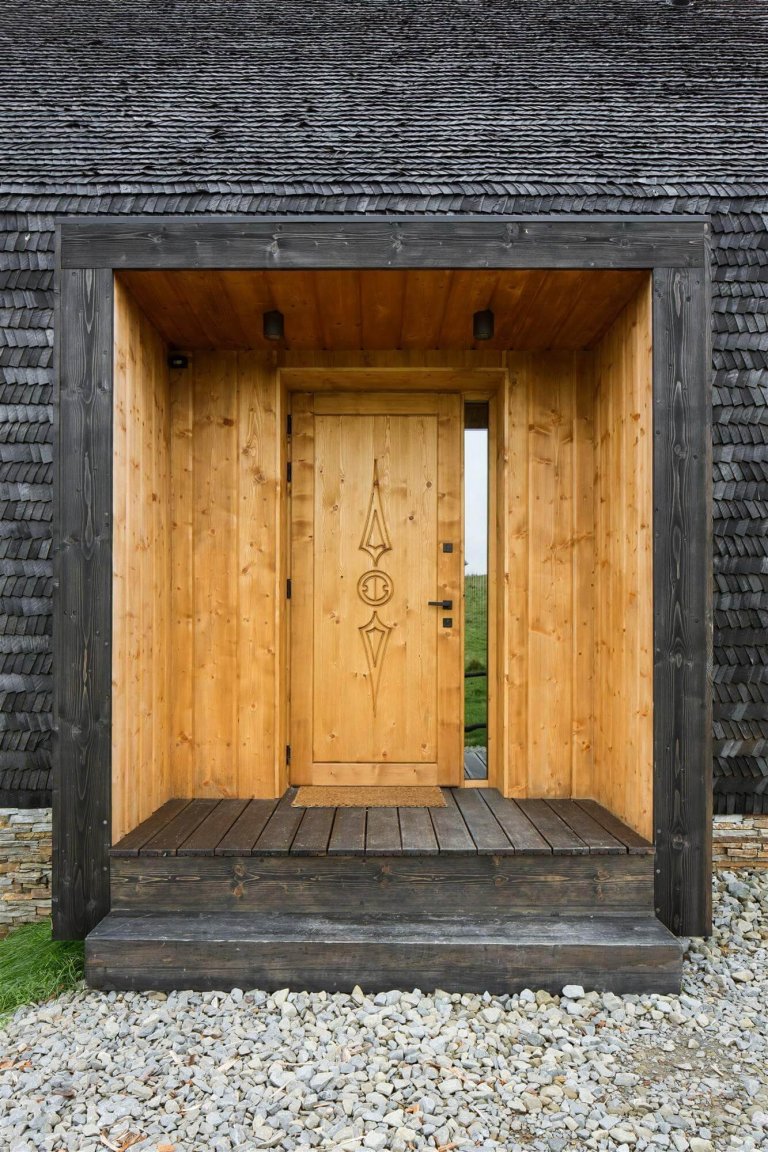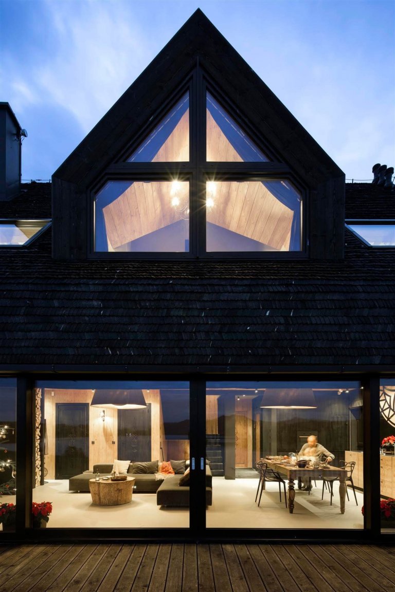 Neobvyklé prvky, kombinace tmavých odstínů a lidové vzory v novém pojetí, to vše činí tento projekt unikátním. Unikátní je už samotná střecha stavby, která navazuje na tradiční lidovou architekturu. Společně s přední stěnou je pokryta střídavě položeným šindelem, typickým pro domy ze severu Polska. Díky plynulému přechodu ze střechy na boční stěnu, při dešti voda přirozeně stéká přes dům až k zemi, bez použití okapů. A že by vás také nenapadlo použít šindel na moderní dům? Jak je vidět i klasické prvky lidového stavitelství dnes mohou posloužit více než skvěle. Dům dostal neobvyklou tvář a s moderními prvky mu to opravdu sluší.