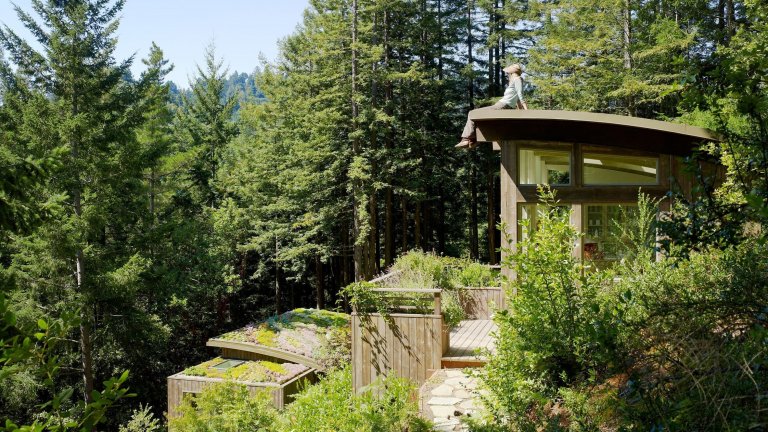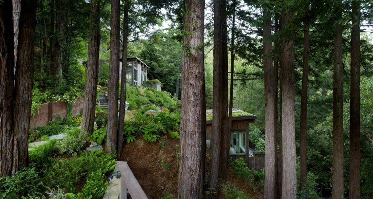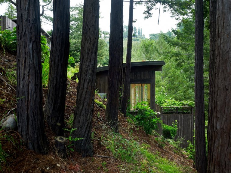 Ačkoliv to tak na první pohled nemusí vypadat, terén, který navíc prudce stoupá, nebyl prvoplánově vhodný k tomu, aby se zde nějaká chata postavila. Architekti ze studia Feldman Architecture o tom říkají: Funkční rozdělení potřeb majitele do samostatných chatek umožnilo snadněji umístit dvě malé struktury mezi stávající stromy. Vysazena střecha spodní budovy vytváří z pohledu horního studia zahradní výzdobu.“ To znamená, že k tomu, aby se v tomto terénu dala chata postavit, musela být navržena jako dva samostatné menší objekty - což majiteli nevadilo, protože každá část slouží k něčemu rozdílnému.