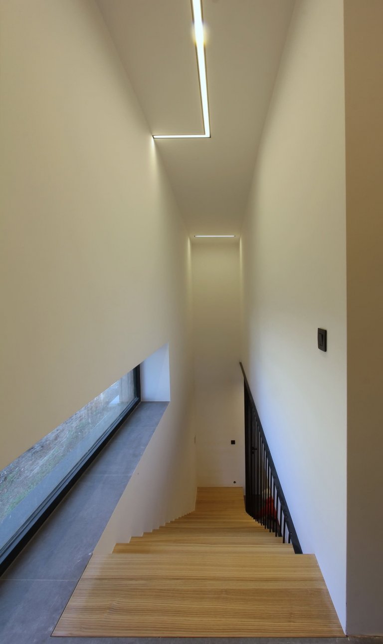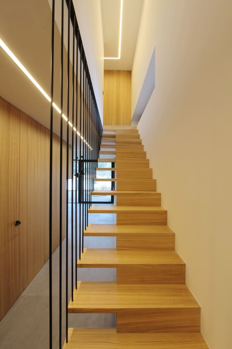 Interiér chaty pojatý v duchu minimalistického stylu na sebe o to více upozorňuje četnými detaily. Na první pohled tak zaujmou především poněkud netradičně řešené schody do patra, které ukazují na symbiózu dvou materiálů, ale také na nápaditost architektů. To samé platí pro originální vzhled židlí, křesel a umělých svítidel. Především hravost rozmanitých druhů umělého světla dodává celému interiéru velice zajímavý charakter. Všechny tyto zajímavé prvky mohou vyniknout zejména díky integrovaným úložným prostorům. Výsledkem je tak minimalisticky zařízený, vzdušný interiér plný světla, jehož krása spočívá v detailech i překrásných výhledech do přírody.