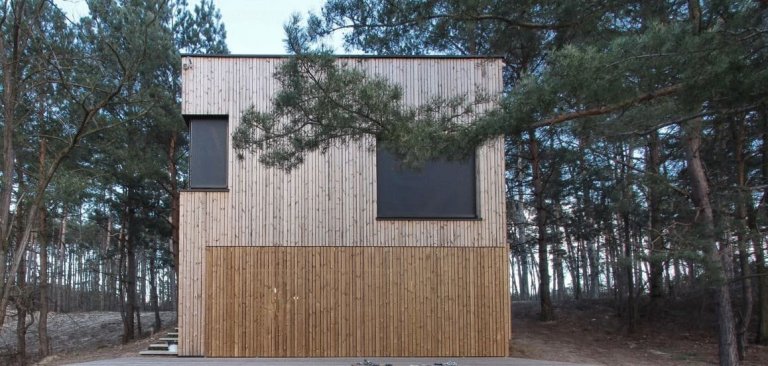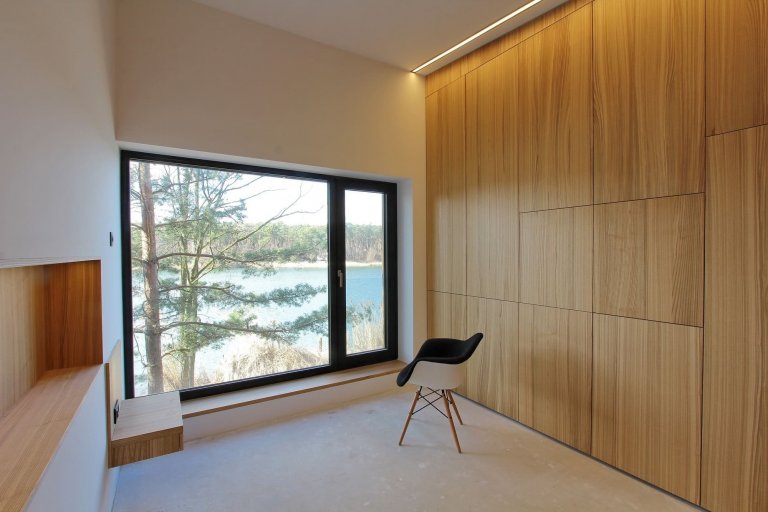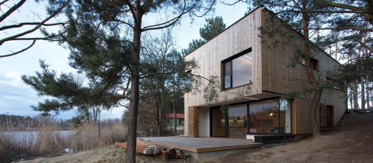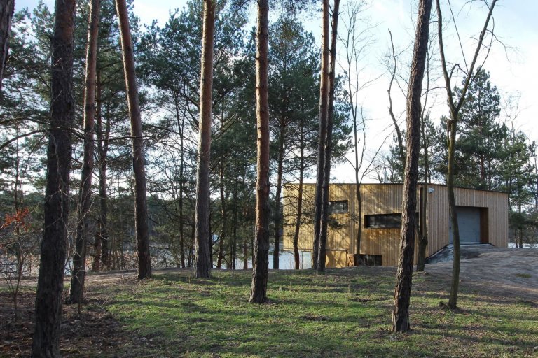 Vzrostlé borovice poskytují obyvatelům chaty potřebný pocit soukromí, a přesto jim nebrání v překrásných výhledech na les i blízké jezero. Z pohledu od jezera to vypadá, jakoby tu dřevěná chata stála odjakživa. Z části stíněná velkými stromy, zato ale otevřená výhledům díky velkým oknům nabízí vysoce komfortní bydlení uprostřed divukrásné krajiny. Chata svou dřevěnou provětrávanou fasádou příjemně splývá s okolní přírodou, nenarušuje ji svým vzhledem a pokorně se utápí v záplavě bujné flóry.