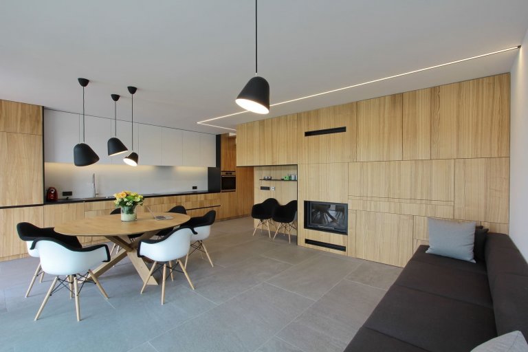 Chata na břehu jezera je do zahrady otevřena nejen zajímavě řešenými velkými okny, ale také menší terasou zapuštěnou do svažitého terénu pozemku. Hned za ní se nachází velké francouzské okno, které lze v případě potřeby otevřít a propojit tak prostor mezi centrální zónou domu a terasou. Tuto odpočinkovou a jídelní část chaty tvoří otevřený prostor spojující obývací pokoj, kuchyni a jídelnu. Uprostřed se nachází kulatý dřevěný stůl s moderními židlemi, zatímco v rohu místnosti trůní komfortní sedací souprava. Převažuje zde černobílá kombinace spolu se světlými tóny dřeva, které celou místnost příjemně prohřívají. Nechybí tu ani zajímavě pojaté umělé osvětlení dodávající prostoru jistou dávku hravosti. V podobném duchu jsou zařízeny i další místnosti. Také ty zdobí přirozená krása dřeva a černobílá kombinace barev.