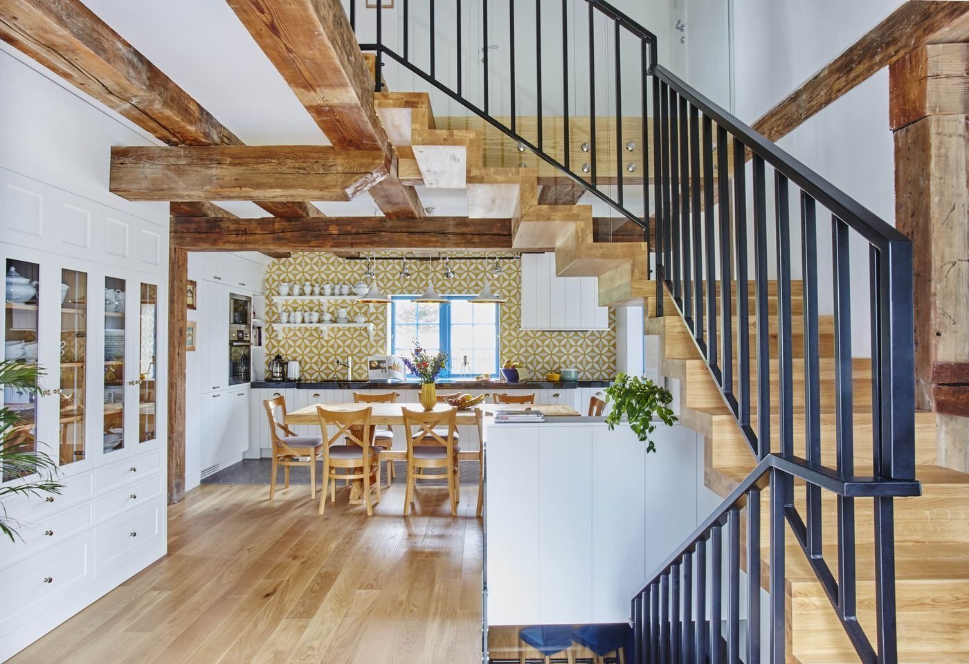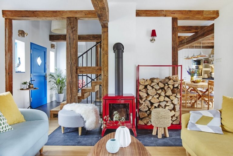Celým bydlením prochází dřevěné masivní trámy navozující venkovskou atmosféru. Nemůže chybět ani dřevěná podlaha, nebo klasická špaletová okna. Ta jsou natřena na krásnou modrou barvu a oživují každou místnost. Okna zastiňují látkové shrnovací rolety, nebo závěsy z přírodních látek.