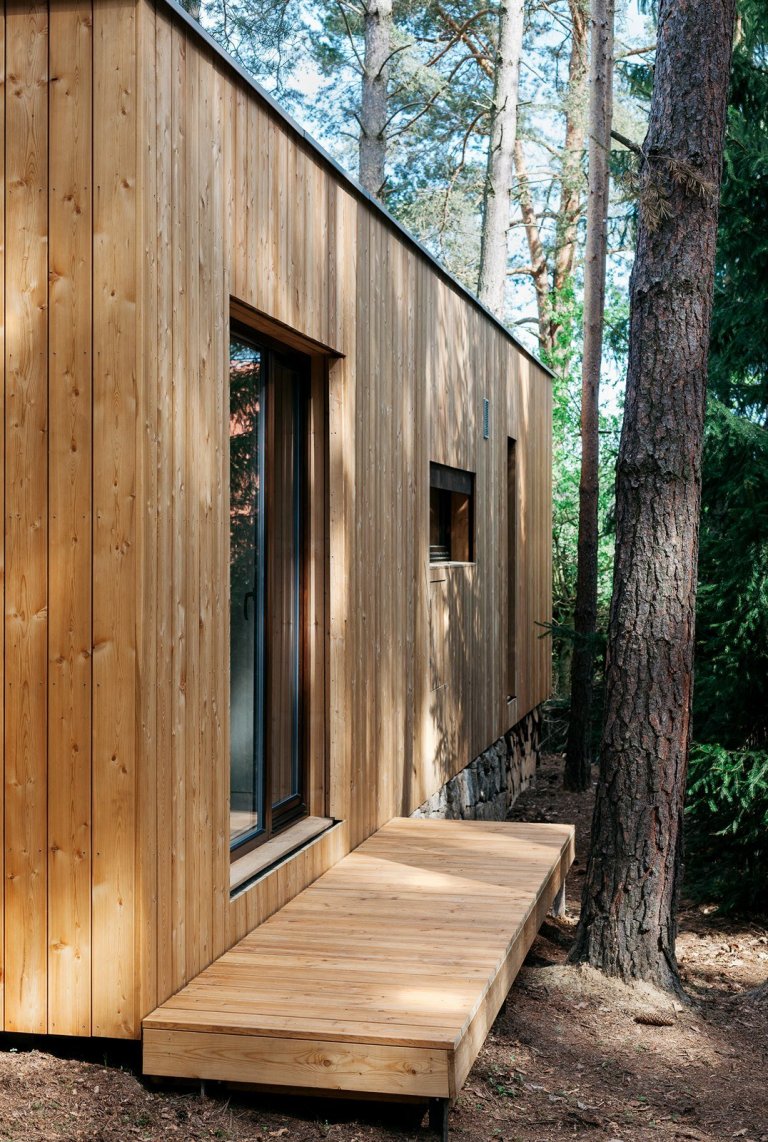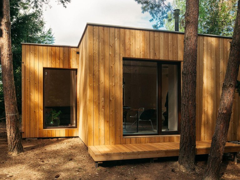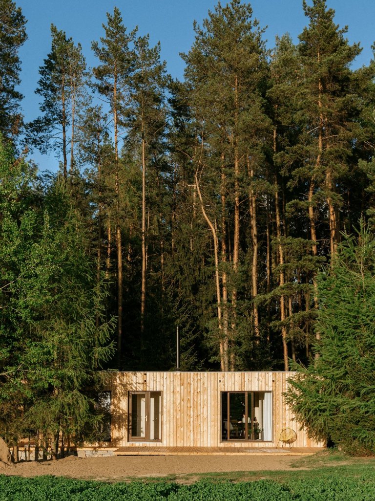 Chata z kontejneru připomíná moderní dřevostavbu