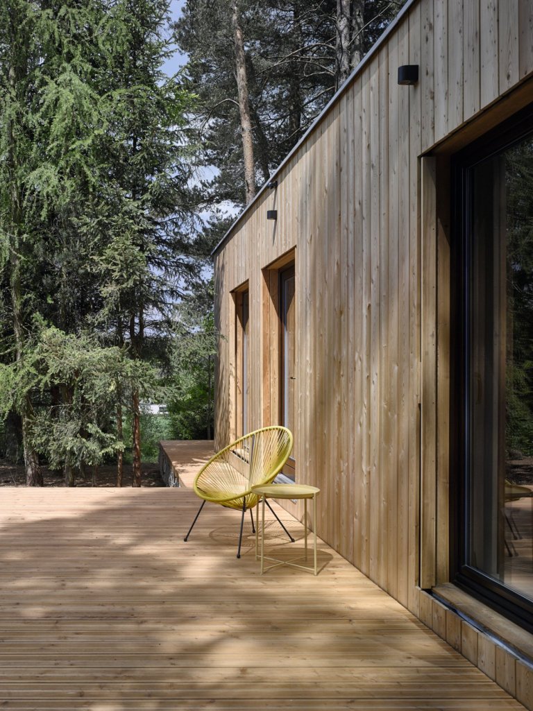 Chata z kontejneru tak bez nadsázky supluje plnohodnotné bydlení, které s sebou nese hned několik výhod. Díky velkým francouzským oknům poskytuje překrásné výhledy do okolí. Originální chatu doprovází hned dvě terasy, z nichž ta větší probíhá přes celou přední fasádu domu. Nabízí tak příjemné místo pro stolování a kochání se všeobjímající přírodou.