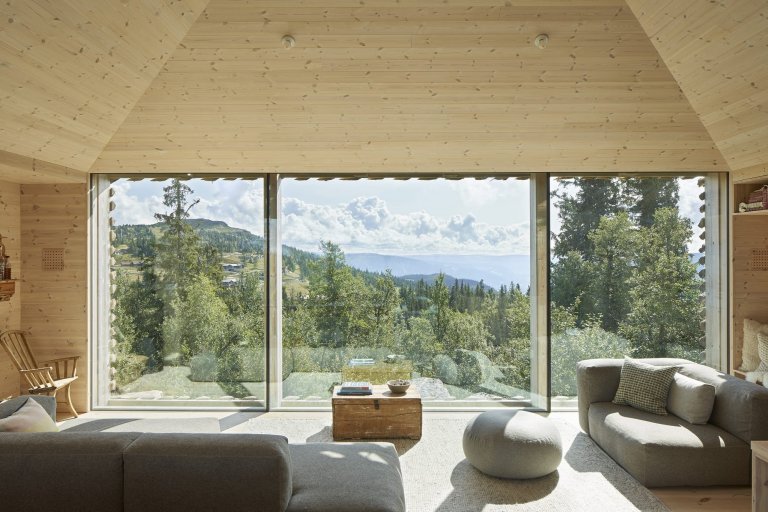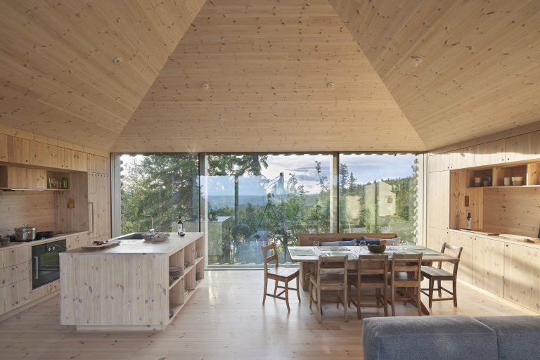 Nově postavená chata na vrcholku hory nám krásně odráží spojení původní architektury se současnými požadavky na život. První co vás okouzlí je fasáda z řezaných polen, které byste asi čekali spíše na oplocení. I interiér je celý provoněný dřevem. Obložení z borovice i nábytek jen podtrhnou fakt, že se chata nachází uprostřed korun stromů. A výhledy do krajiny podpoří dvě panoramatická okna.