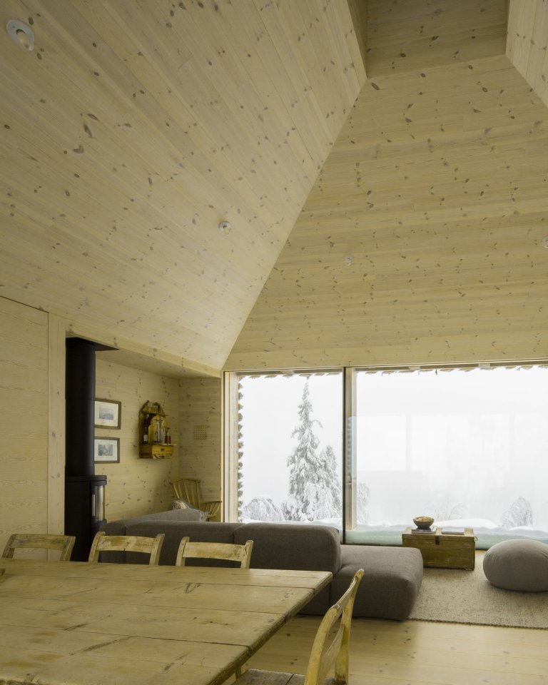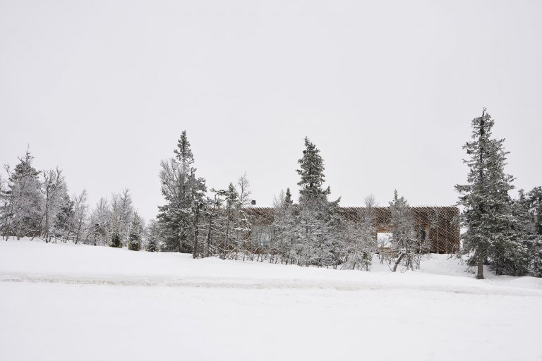Vzhledem k použité venkovské architektuře je díky drsné fasádě chata vhodná i do těžkých povětrnostních podmínek a lesní vegetace. V zimě, kdy jsou mezery mezi kládami zaplněny sněhem, získává chata nový, jemnější vzhled. Zelená střecha je osázena trávou spolu s břidlicí a dřevem, které změkčuje tuhou přímočarou geometrii budovy, ošlehanou větrem.