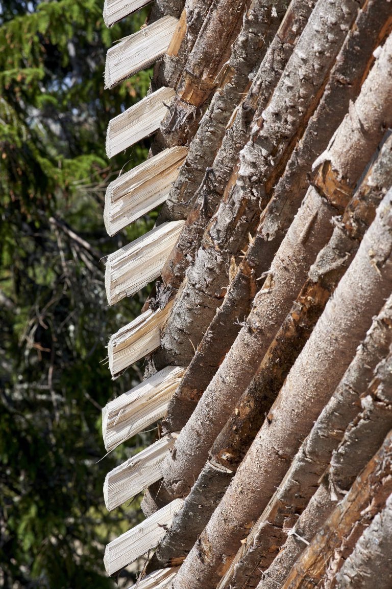 V zimě, kdy jsou praskliny naplněny sněhem, se stává z polen dokonalá tepelná izolace a snižují se náklady na vytápění. Uspořádání chaty na stojkách, které jsou vlastní v tradiční skandinávské výstavbě, má několik cílů. Zaprvé vám umožní nechat nedotčenou okolní krajinu, kterou můžete obdivovat z oken umístěných na vysokých podpěrách domu. Za druhé, v zimních měsících budou chránit dům před závějí a během jarního tání před vodou. Za třetí, kořeny sousedních stromů nejsou poškozeny během výstavby, což je vlastní moderním požadavkům na životní prostředí během výstavby budov.