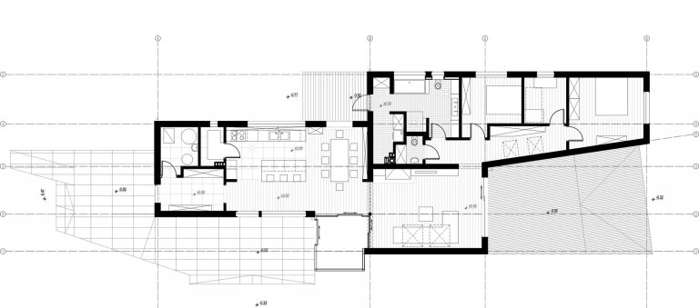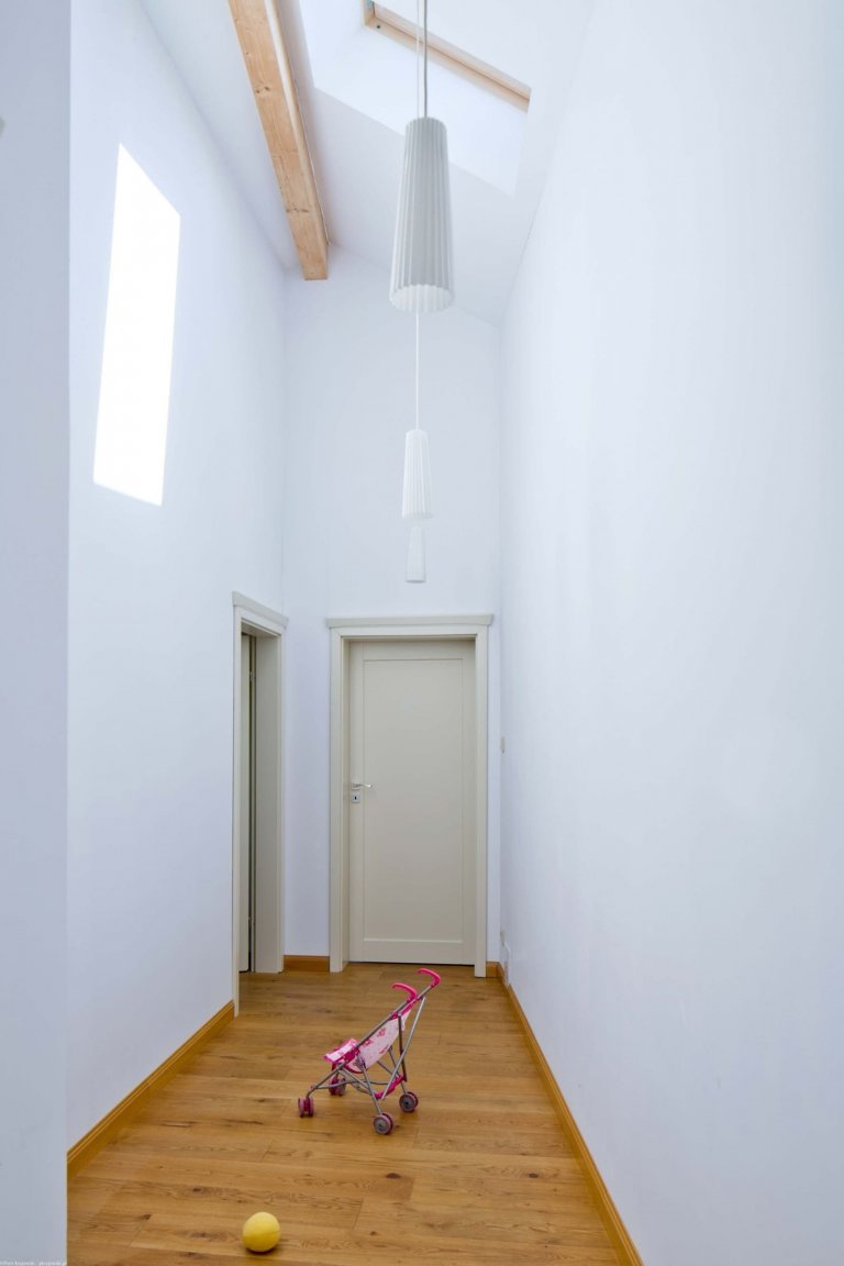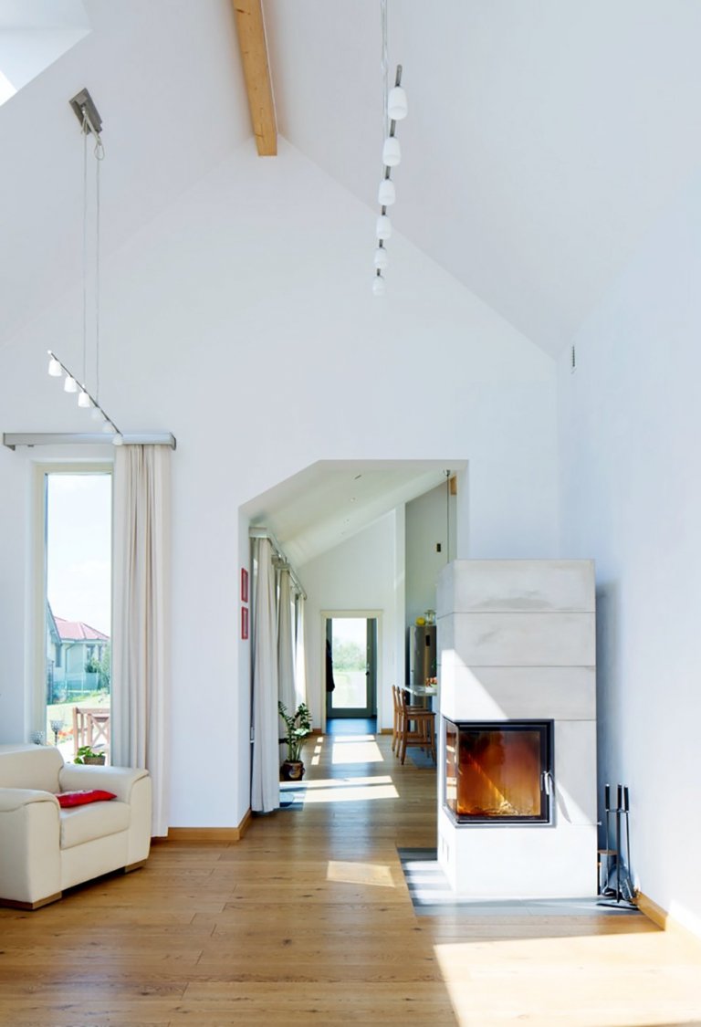 Rustikální tvar domu však skrývá moderní interiér. Denní zóna je otevřená s moderní kuchyní, ve které je dostatek úložného prostoru. Vše je zařízeno do přívětivé až minimalistické podoby. Vysoký strop podepřený dřevěnými trámy působivě kontrastuje s bílou omítkou. Bílá si skvěle rozumí s barevným nábytkem a dekoracemi. Při zařizování domu se architekti snažili navázat konzistentní dialog mezi tím, co je nové a co je staré, tradiční. Lze s jistotou říci, že úspěšně.