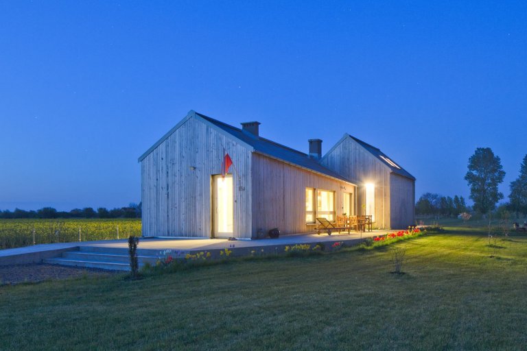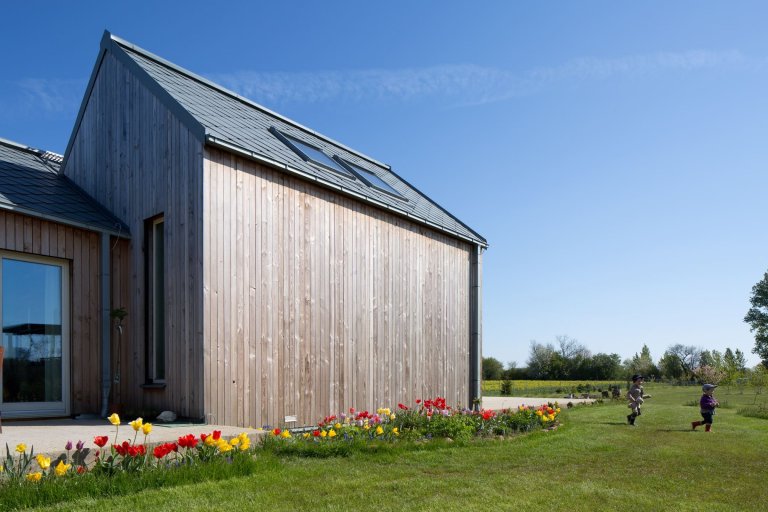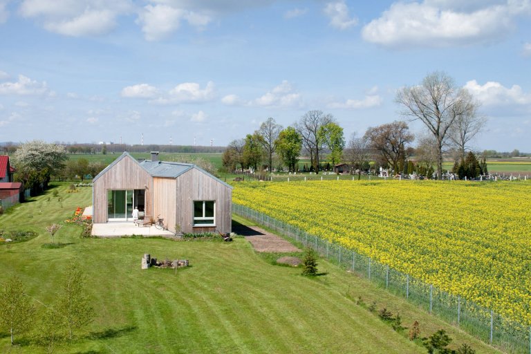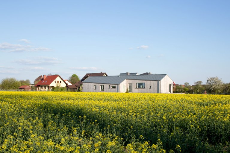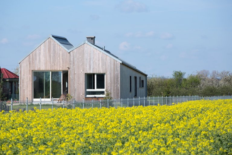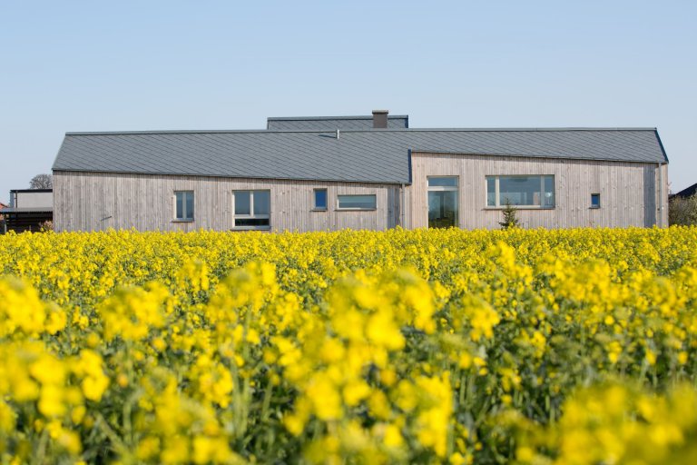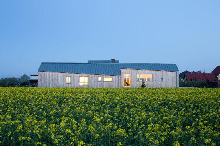 Stále častěji převládá u rodin touha po klidném životě na venkově. A stále častěji jsou nové domy stylizované do rustikálních a industriálních stodol. Takovým příkladem je dům na kraji vesnice, obklopený rozlehlými poli, na kterých potkáte ptáky, zajíce i jeleny. Dům byl na pozemek situován tak, že z jedné strany domu vidíte okolní vesnické budovy z 19. století a z druhé rozsáhlá pole pokrytá plodinami, momentálně řepkou.