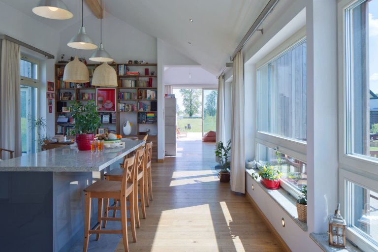 Architekti se snažili navrhnout dům, který zachytí různé scenérie za okny. To byl výchozí bod, kolem kterého bylo dotvořeno vše ostatní. Okna byla umístěna tak, aby poskytovala pohled na každý z okolních krajinných prvků. Z obývacího pokoje je výhled na vzrostlé stromy, zatímco z jídelny můžete obdivovat měnící se roční období odrážející se ve vegetaci pole. Jídelní prostor vytváří s kuchyní otevřenou zónu, která kromě své orientace na rozkvetlé pole nabízí i dostatek prostoru pro setkání s rodinou, která bydlí hned vedle.