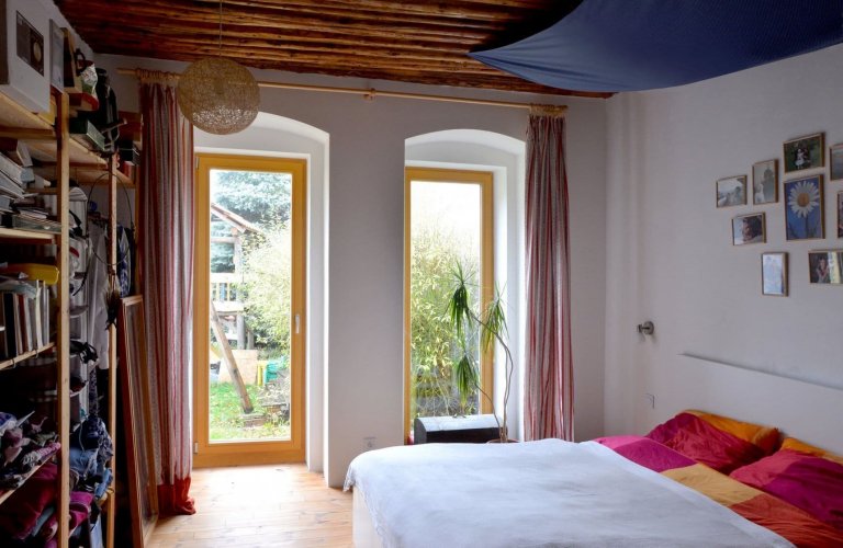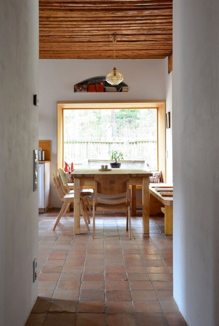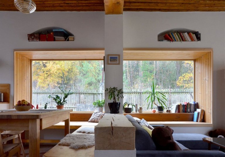 Pod nízkými klenutými výklenky z původních oken, jež v současnosti zaplňují knihy, se nacházejí velká okna poskytující velkorysé výhledy do zahrady. Hluboké parapety a lavice pod nimi nabízejí místo k posezení, ale i k umístění pokojových květin či knih. Vzniká tak kouzelné místo určené k odpočinku a rozjímání nad krásou okolní přírody i rustikálně zařízeného domova. Přímo do zahrady lze přitom vstoupit prosklenými dveřmi z ložnice. Velké prosklené plochy obecně přinášejí do interiéru domu dostatečný přísun denního světla. Výsledný prostor je tak důmyslně vtažen do děje zahrady a navazujícího lesa.