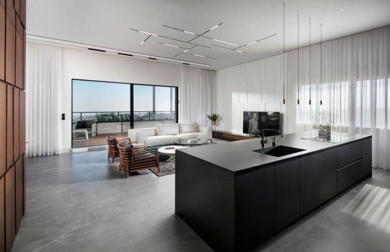 Studio Erez Hyatt bylo požádáno, aby navrhlo moderní podkrovní byt v nejvyšším patře o rozloze 170 m2. Jeho majitel si v prvé řadě přál velký obývací pokoj zařízený v minimalistickém stylu, který by působil uklidňujícím dojmem. Interiér bytu byl kompletně přeměněn tak, aby zahrnoval masivní dřevěný prvek ve tvaru kostky. Ten umožňuje elegantní oddělení soukromé a společenské části bytu. Ukrývá se v něm hlavní vchod, ložnice a koupelna.