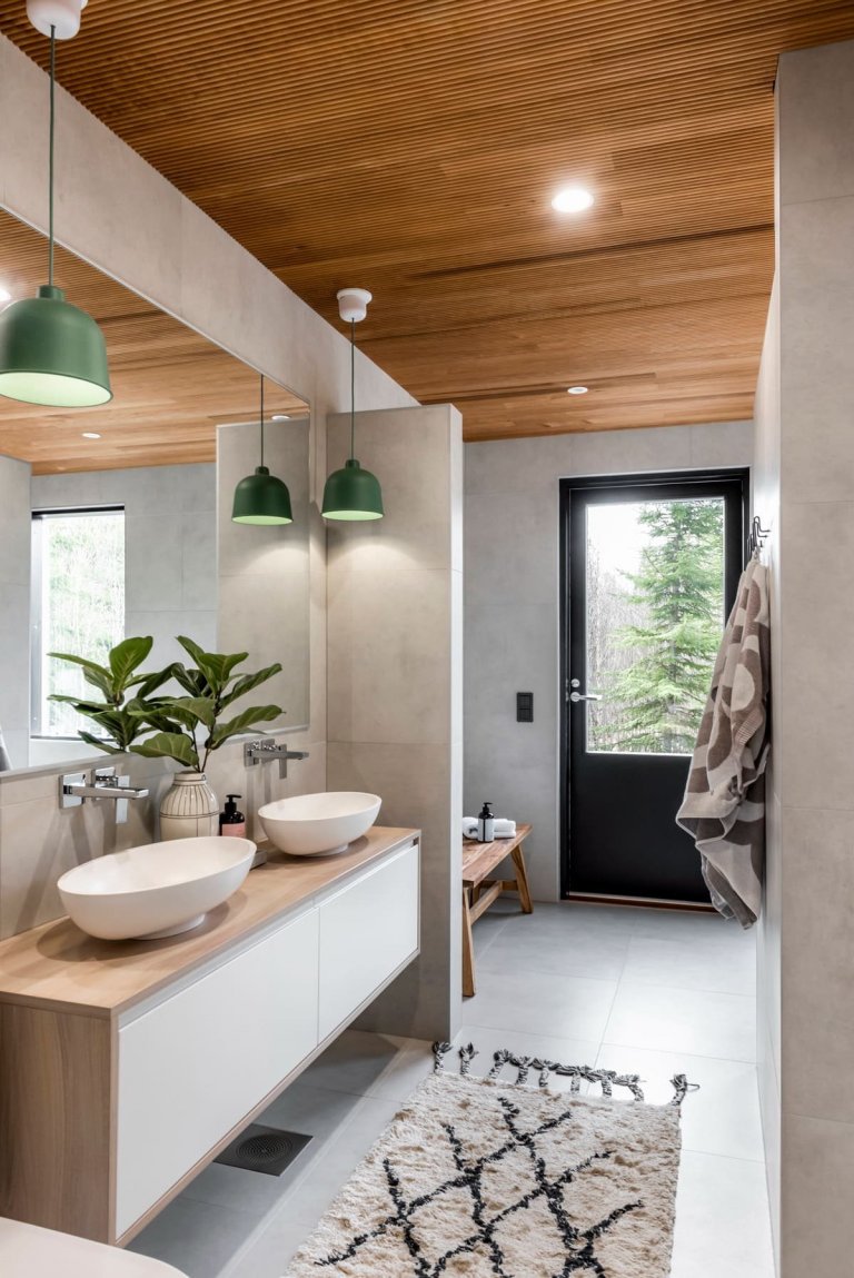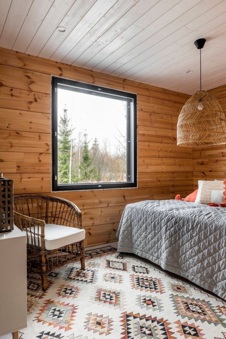 Jenni už dlouho snila o ložnici, ve které by měla i svou šatnu. Ve zbrusu nové dřevostavbě si svůj sen konečně splnila. Do šatny se teď dostane z obou stran široké manželské postele. Šatní skříň přitom v tomto prostoru nepůsobí vůbec rušivě. Její ostřejší kontury příjemně rozostřuje romantický nádech interiéru ložnice. Obdobné barevné i materiálové schéma klidové zóny představuje společenská část domu. Velký prostor se šikmým stropem uprostřed je příjemně otevřený. Strukturální prvky rozdělují jednotlivé funkční části. Strop v kuchyni je přitom výrazně nižší než ve zbytku prostoru. Jídelnu a obývací pokoj odděluje působivý oboustranný krb. Barevné schéma propůjčené z přírody je v souladu s výhledy z velkých oken. Zahrnuje prvky zralé kukuřice, přírodní odstíny dřeva, šedé odstíny kamenů a dokonce i zeleň jehličí. Osobitost interiéru umocňují černé posuvné dveře, rámy oken a plakáty na stěnách.